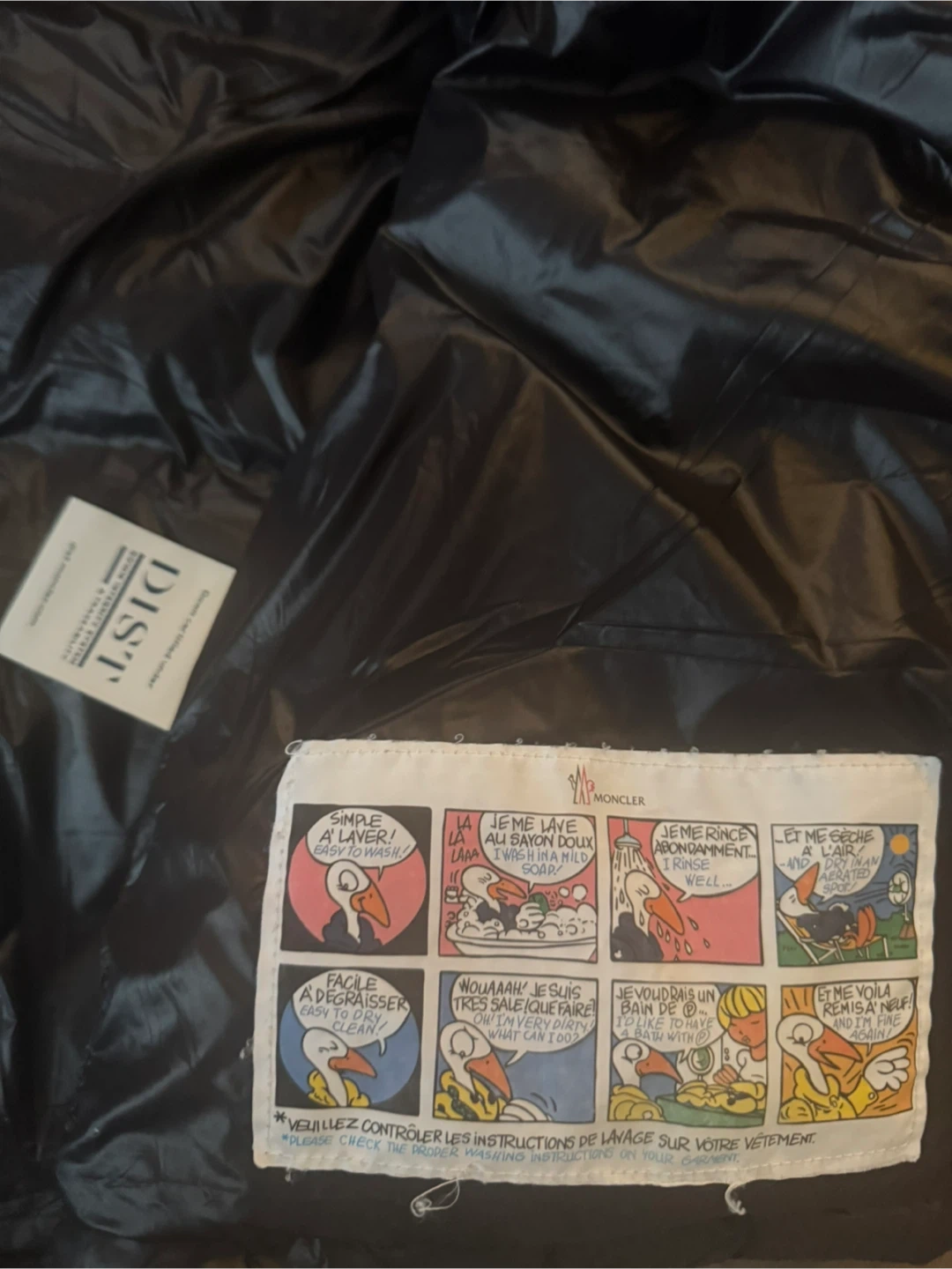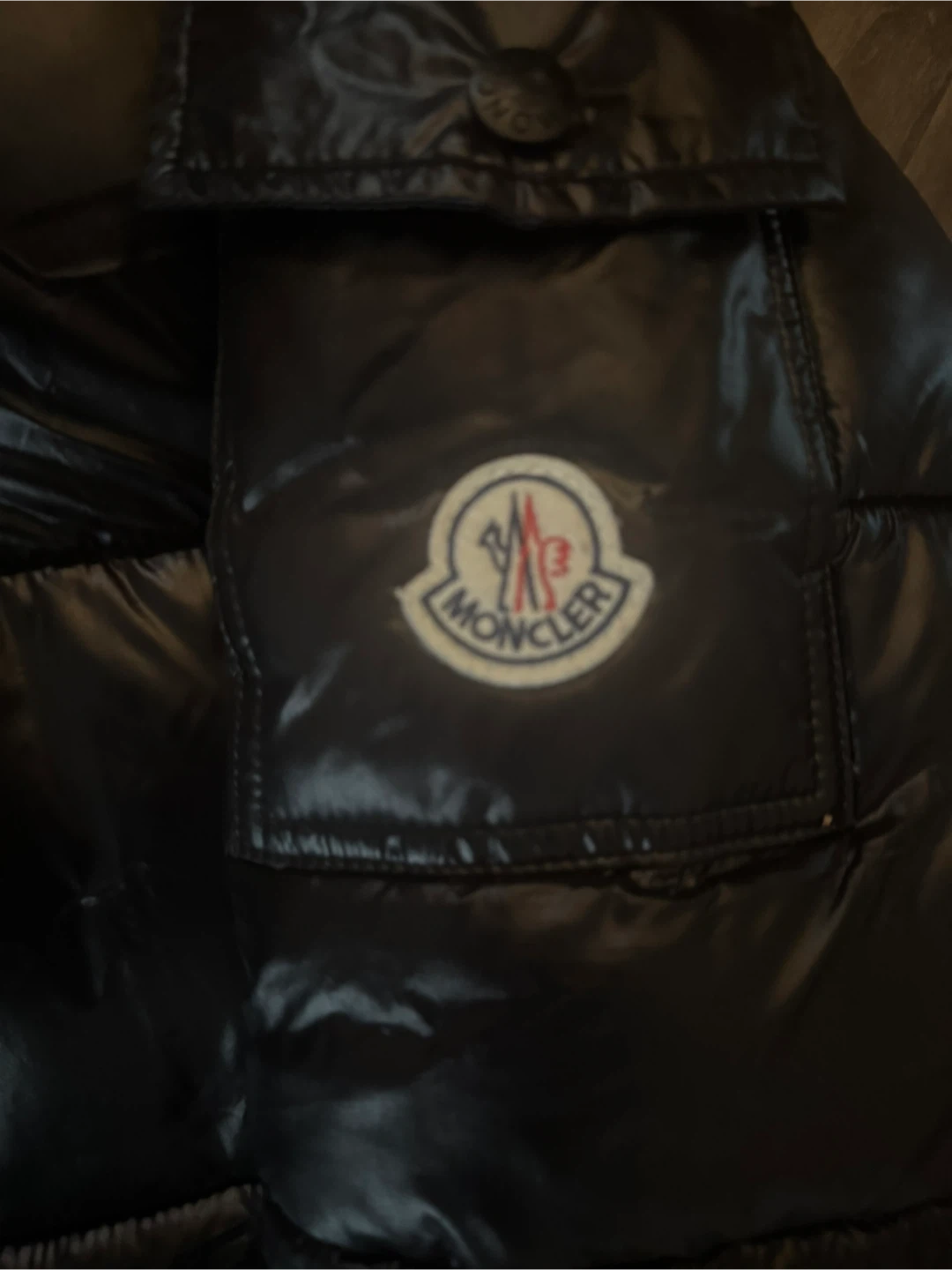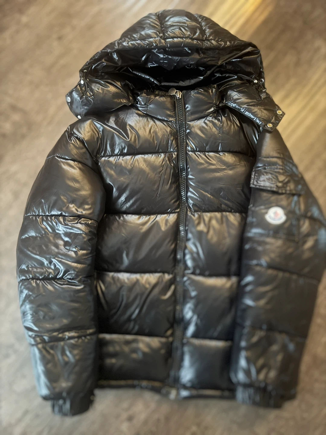 This is a black Moncler down puffer jacket. It features a hood and the iconic Moncler logo on the sleeve. Made with high-quality materials for warmth and style. Keep cozy during colder months!