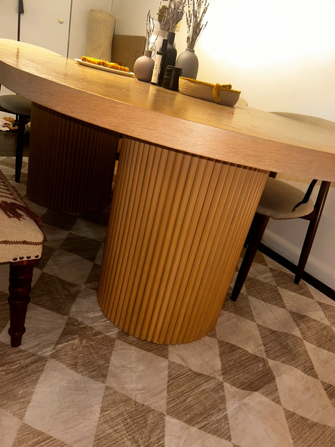 This oval dining table features a distinctive fluted pedestal base in a natural oak finish. Its unique design adds a modern touch to any dining space. Table only configuration.
