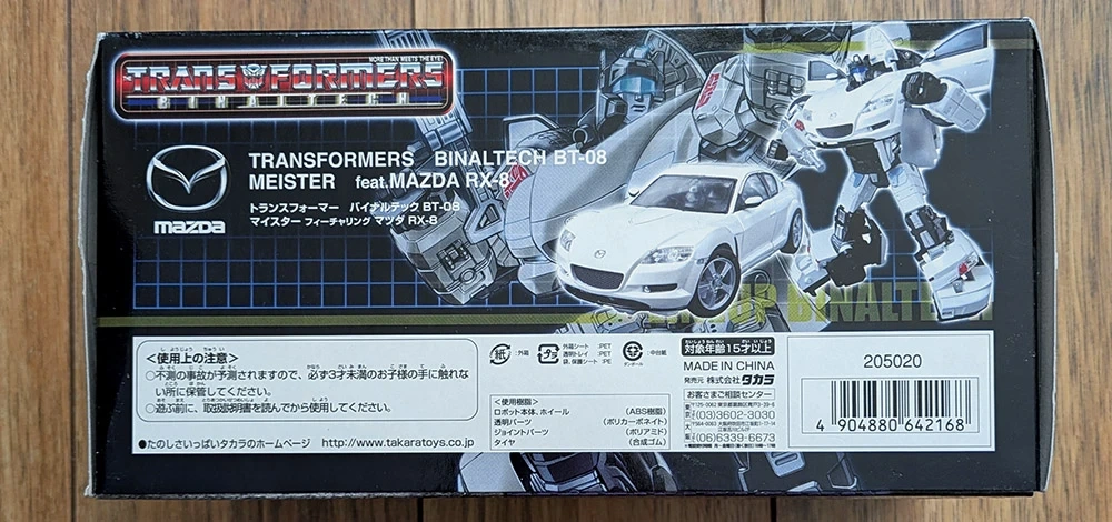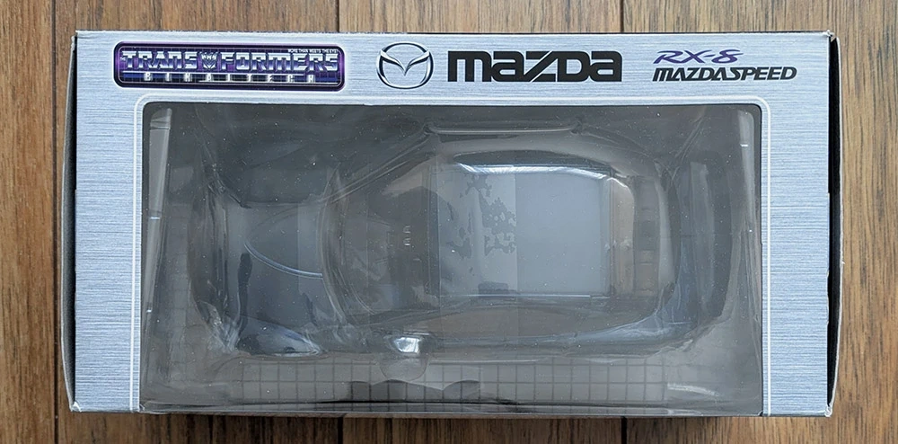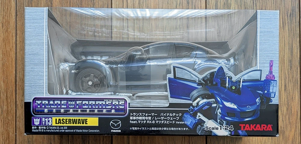 "Laserwave", BT-13, from the Transformers Binaltech line, brand new, factory sealed. Modelled after a dark purple Mazda RX-8 Mazdaspeed Version II in 1:24 scale.