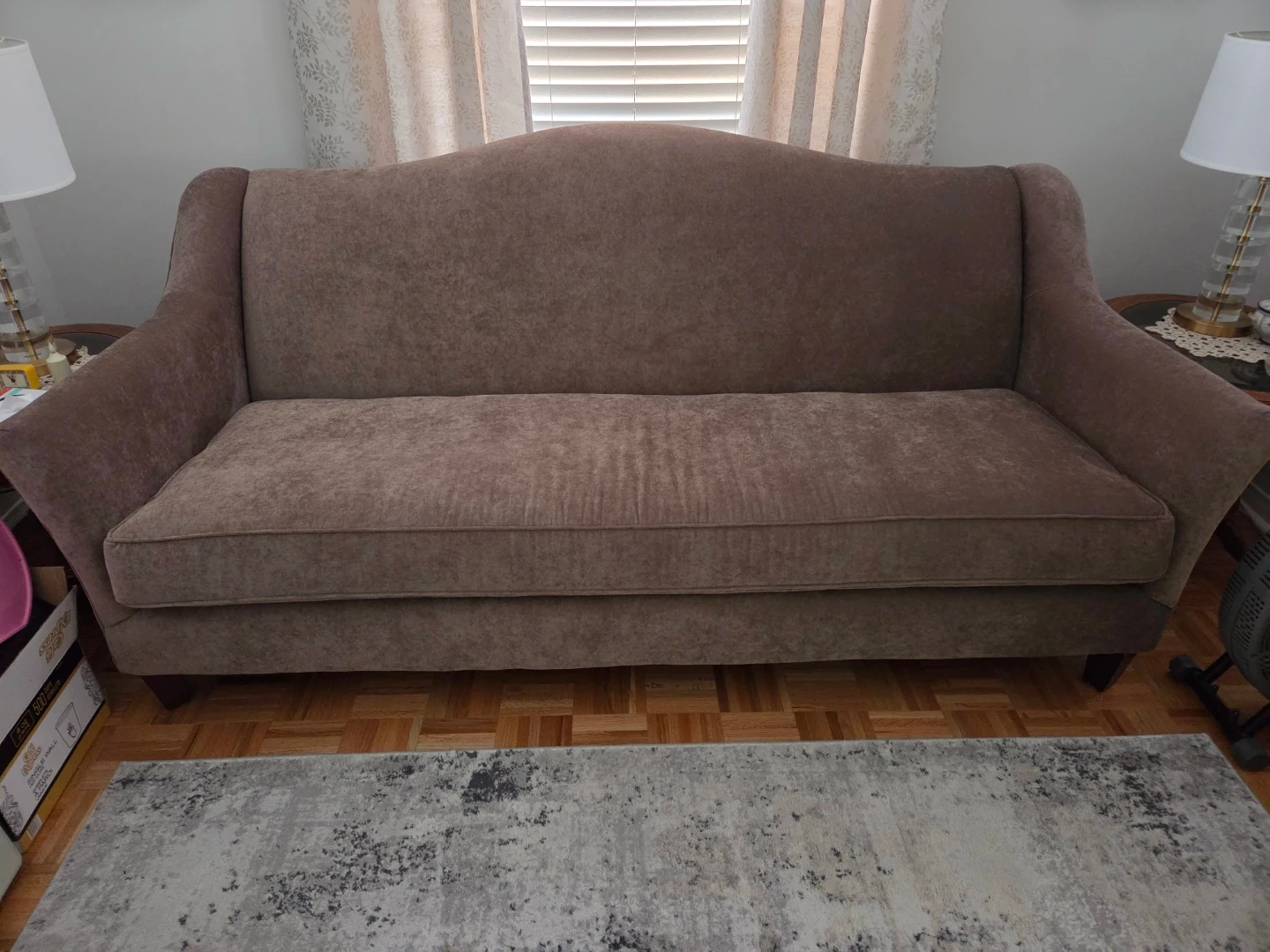 This is a comfortable brown velvet sofa. It's upholstered in a soft, textured fabric. It's a great addition to any living space!