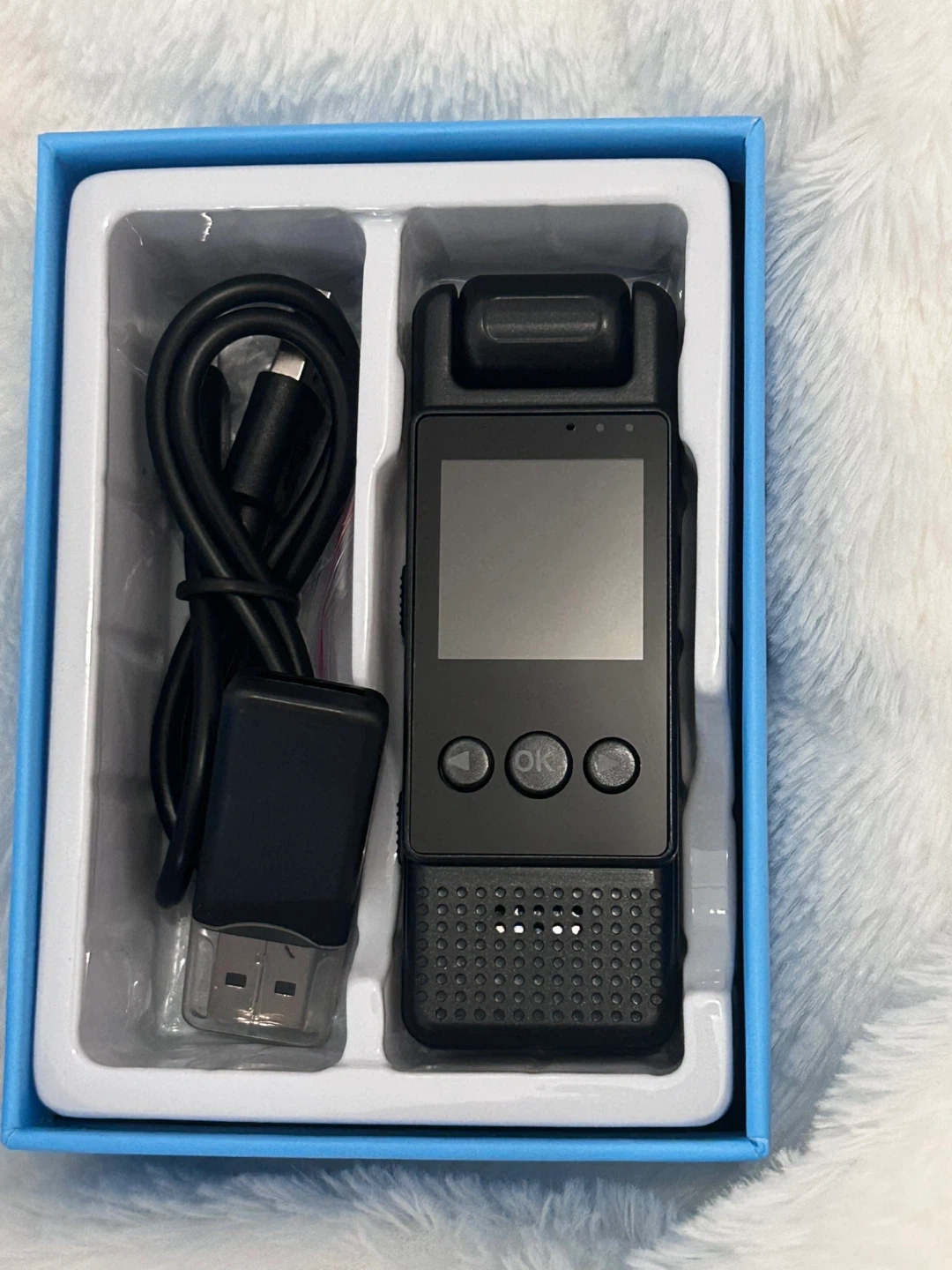 This is a 1080P mini body camera with 32GB of storage included. It's compact and comes with a USB charging cable. A user manual is also provided. It's useful for recording events or as a personal security device.