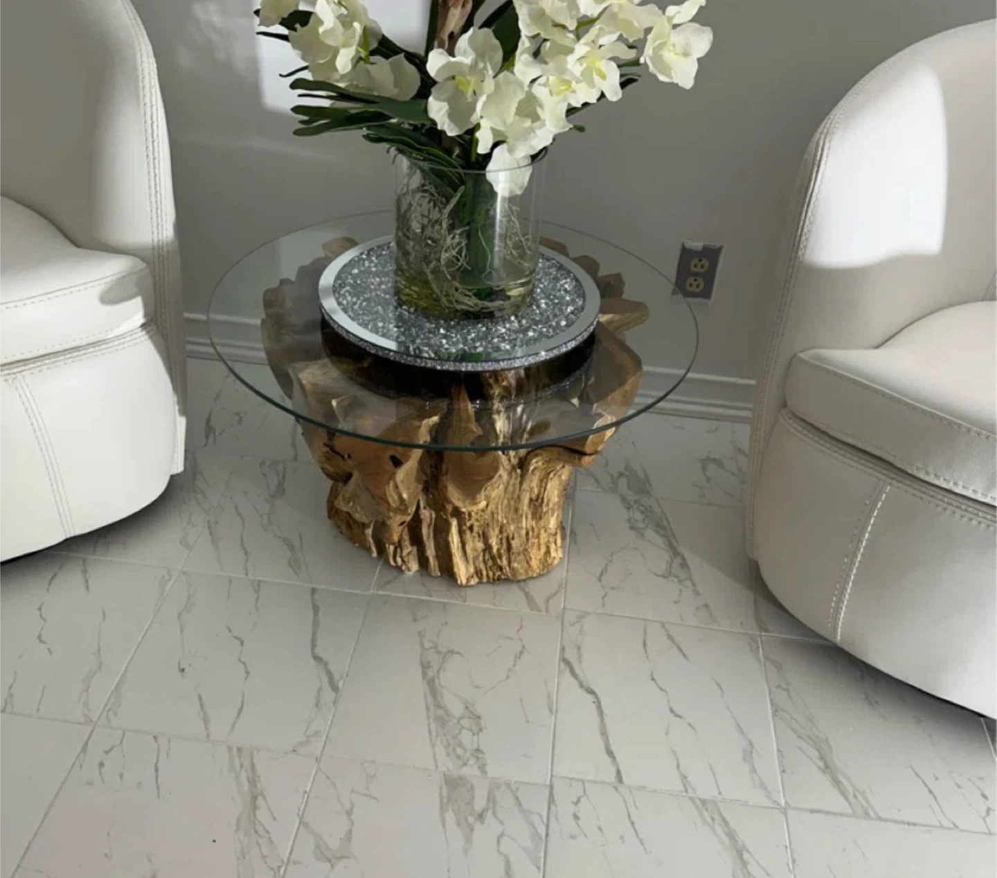 Brand NEW Unique coffee table with a glass top and a distinctive wood base! It's a real statement piece.
