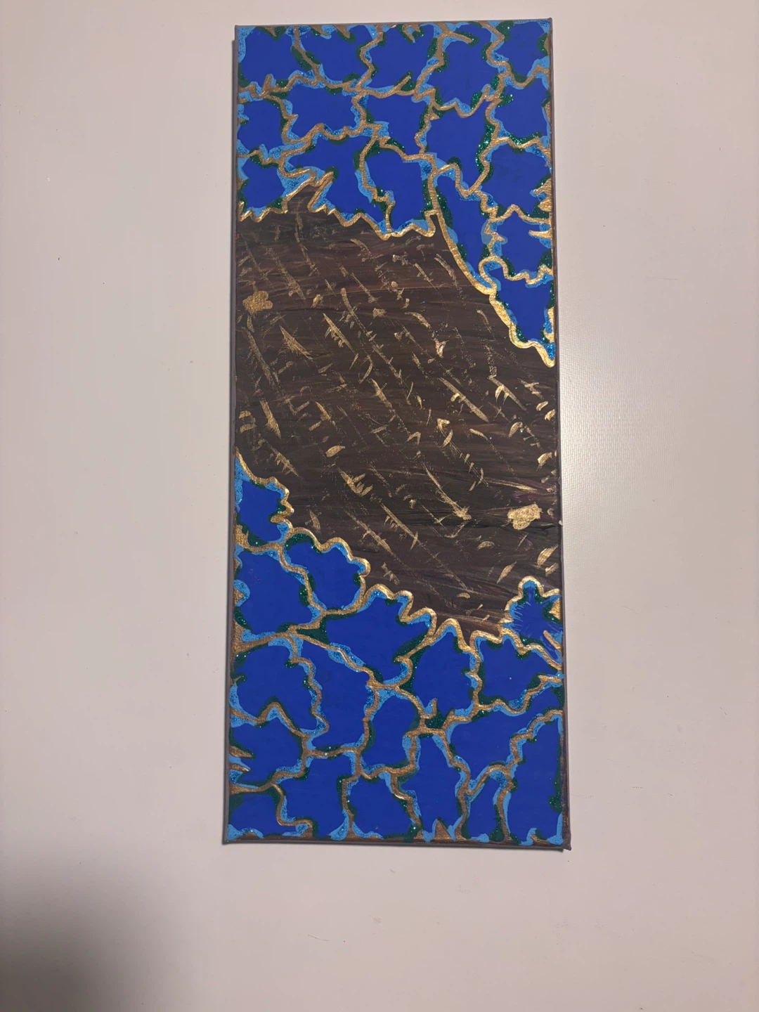 Unique abstract painting featuring a striking combination of blue and brown hues. The design incorporates gold accents, adding a touch of elegance. Perfect for adding a pop of colour and visual interest to any room