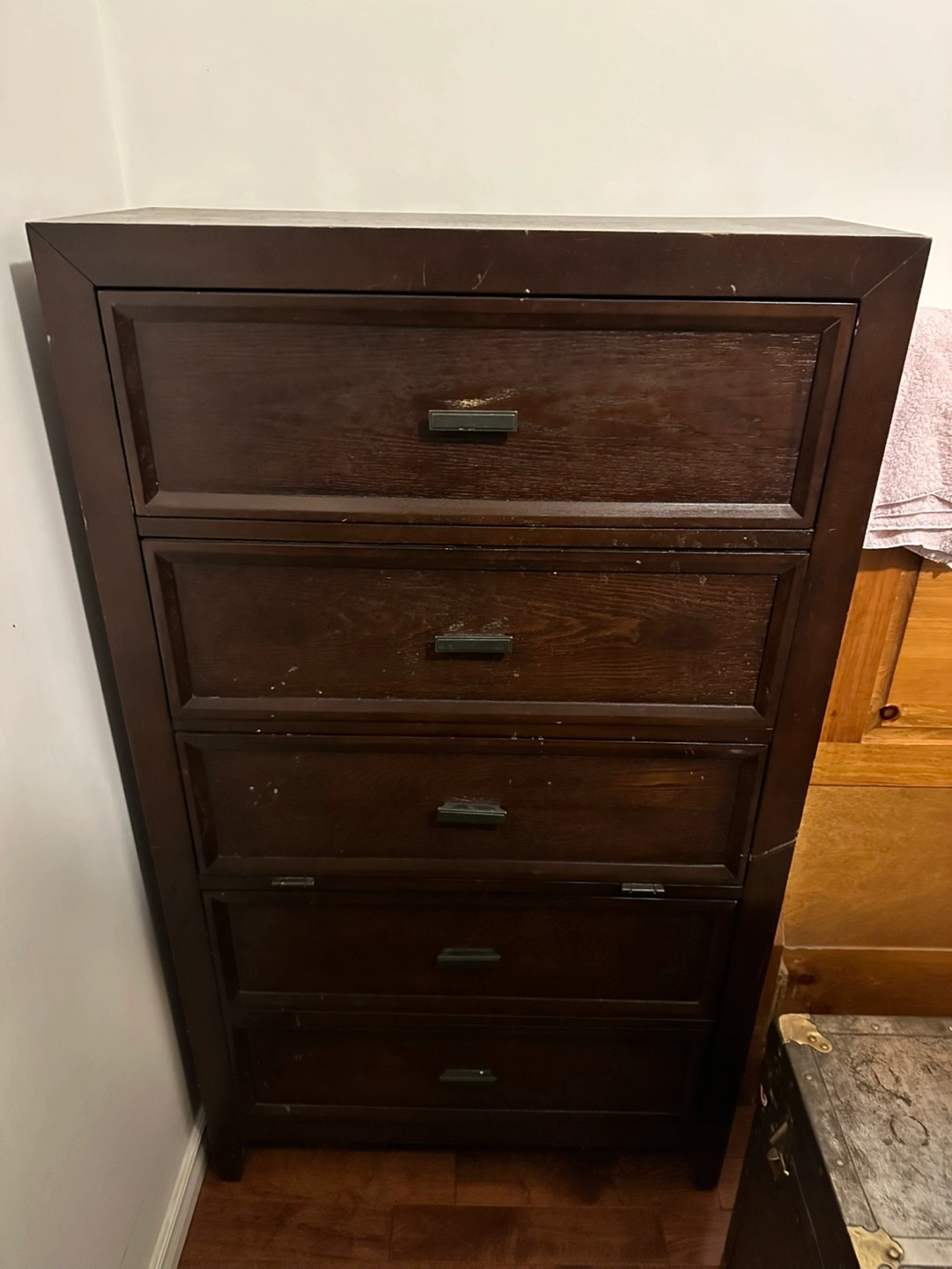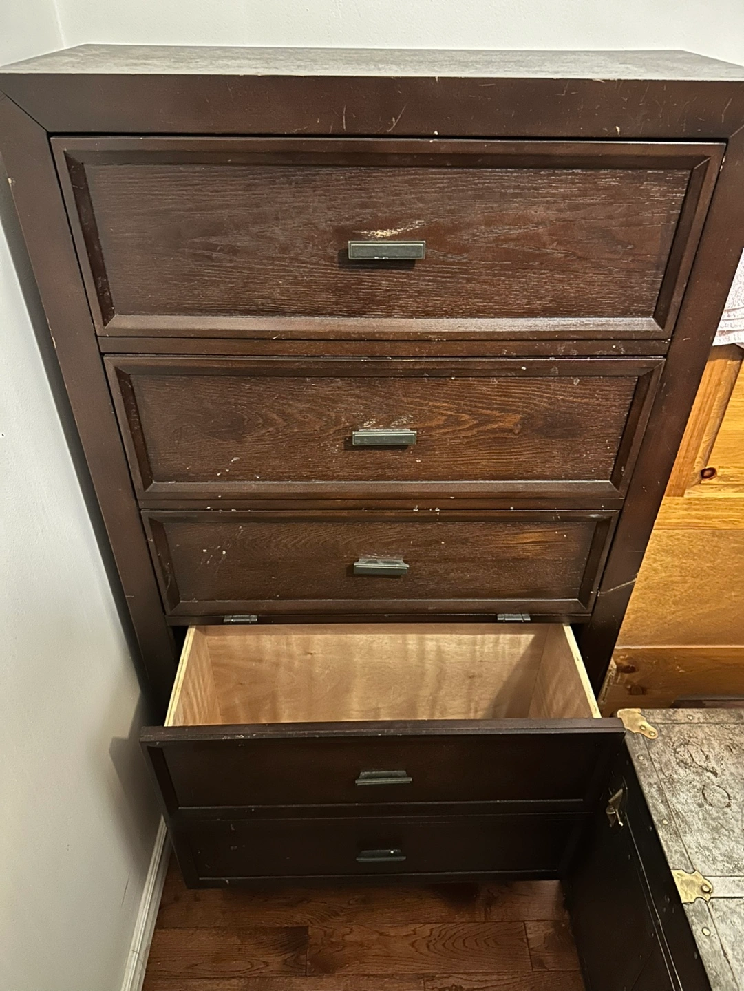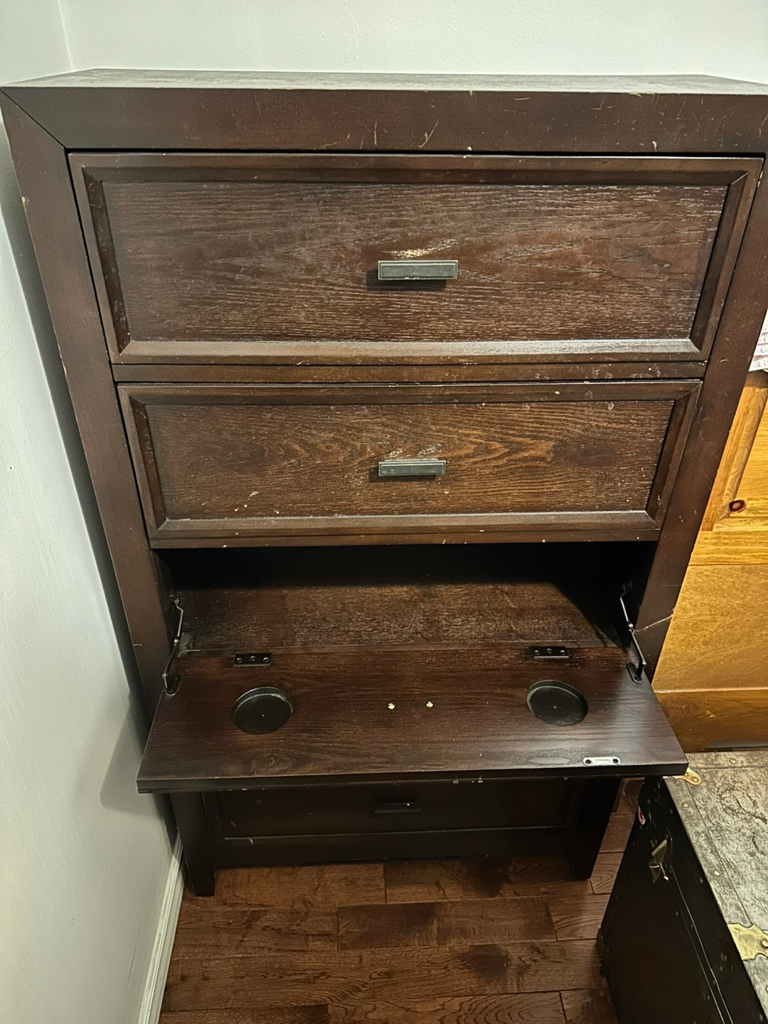 Measures at 52.5 in tall X 30in wide X 12 in deep with large bottom storage drawer and night table pull out lip with cup holder slots (as seen in picture). Dark brown/ reddish colour. Some cosmetic scratches. Make me an offer!!