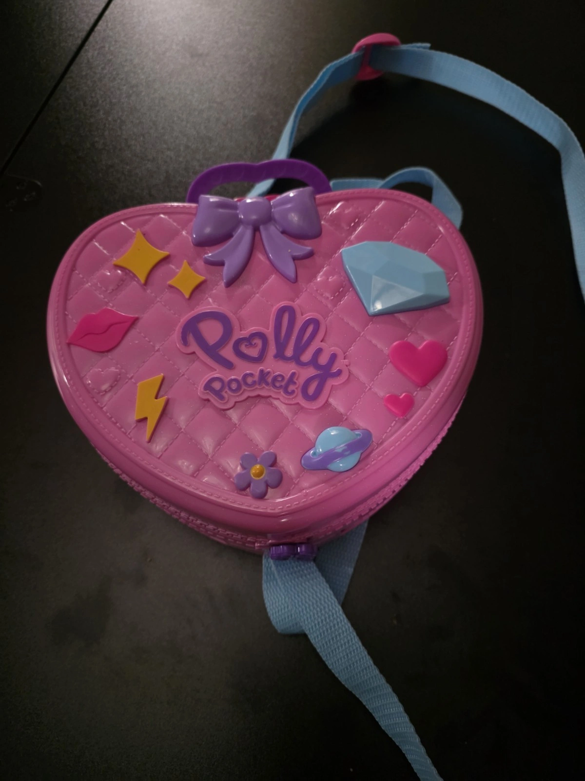 This is a used, original Polly Pocket Theme Park Playset. It's a pink heart-shaped backpack that opens up to reveal the playset. Made of hard plastic, manufactured between 1990-1999. Comes without original packaging.