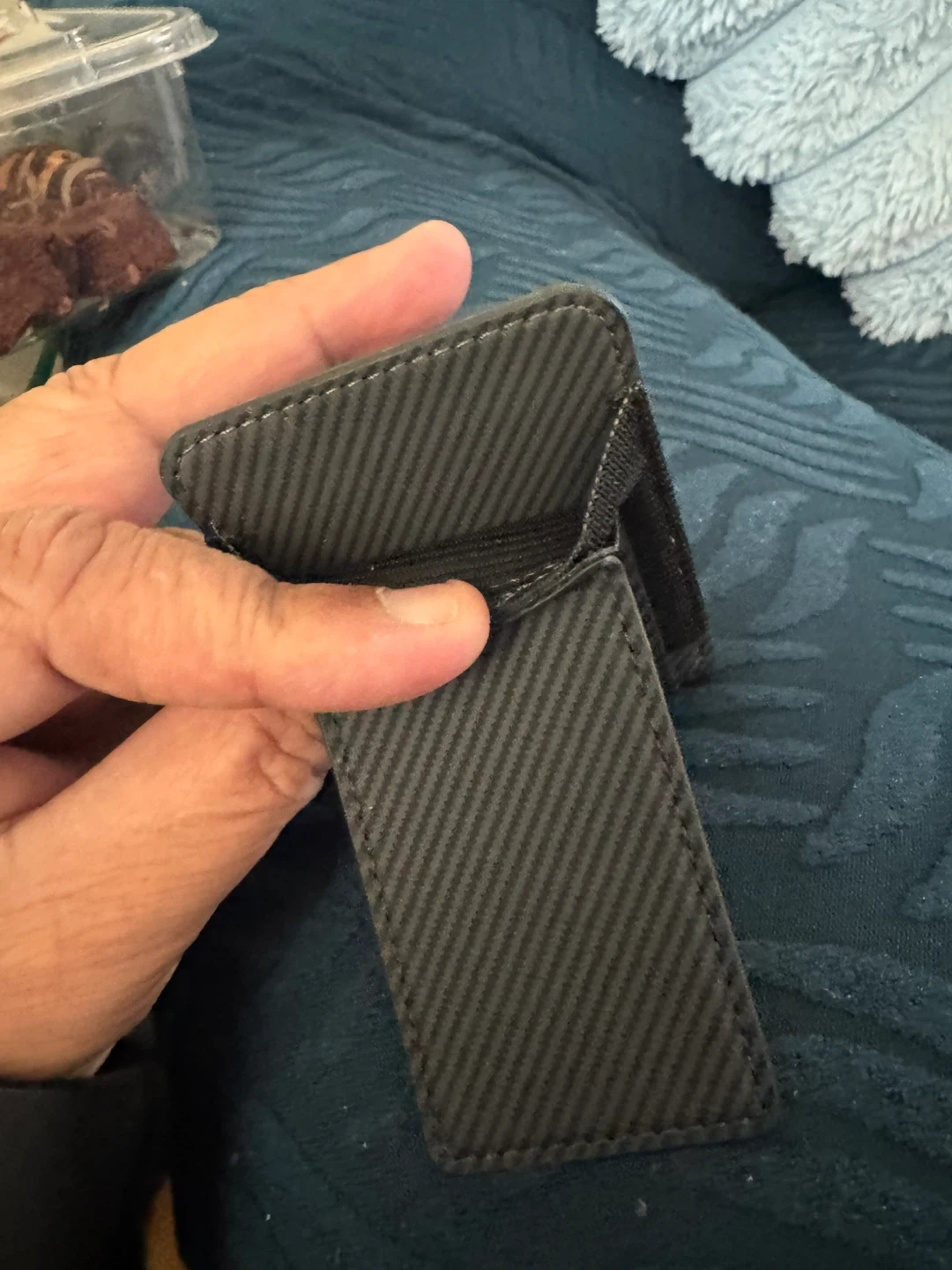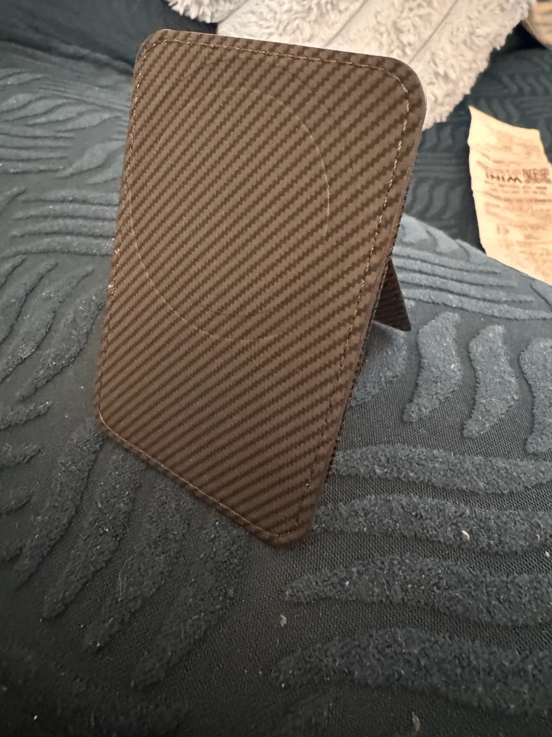 A sleek carbon fibre card holder with a stand function. It's designed to hold your essential cards securely. Folds flat for easy storage.