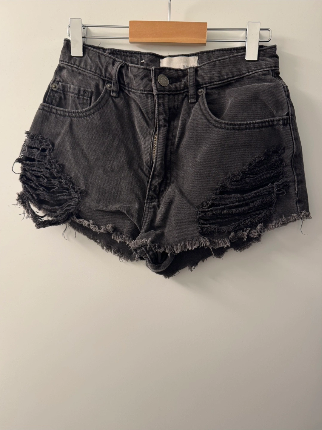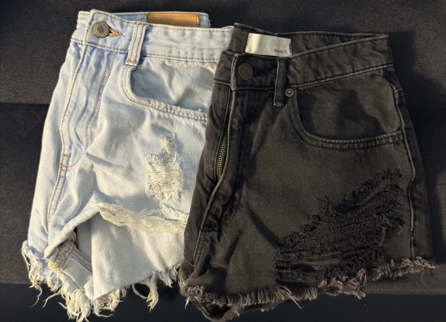 Great condition high rise ripped denim shorts! Light blue wash is size 24 from Zara and black is 0 from Garage. Take both for $5 or $5 for the black and $3 for the blue.