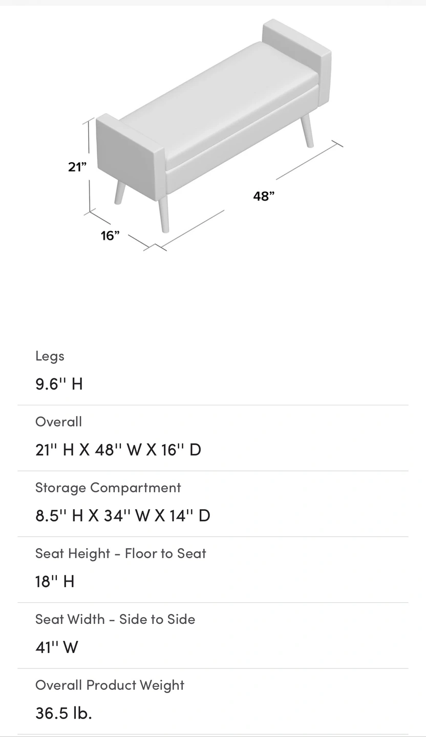 Clean-lined storage bench full of mid-century modern style. Its boxy frame rests on brown-hued tapered dowel legs made from solid wood. Wrapped in velvet, the two-person seat also features square arms and a foam fill to provide plenty of support. The seat also lifts to reveal spacious storage for board games, books, and much more.