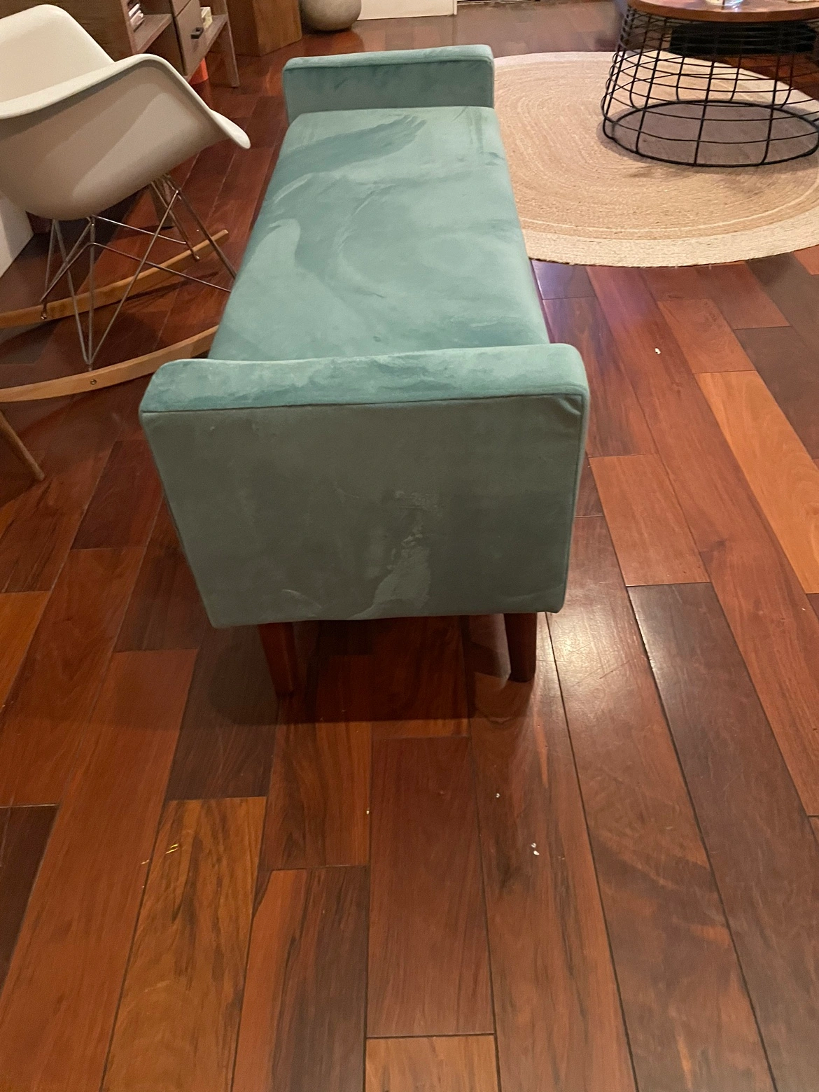 Clean-lined storage bench full of mid-century modern style. Its boxy frame rests on brown-hued tapered dowel legs made from solid wood. Wrapped in velvet, the two-person seat also features square arms and a foam fill to provide plenty of support. The seat also lifts to reveal spacious storage for board games, books, and much more.
