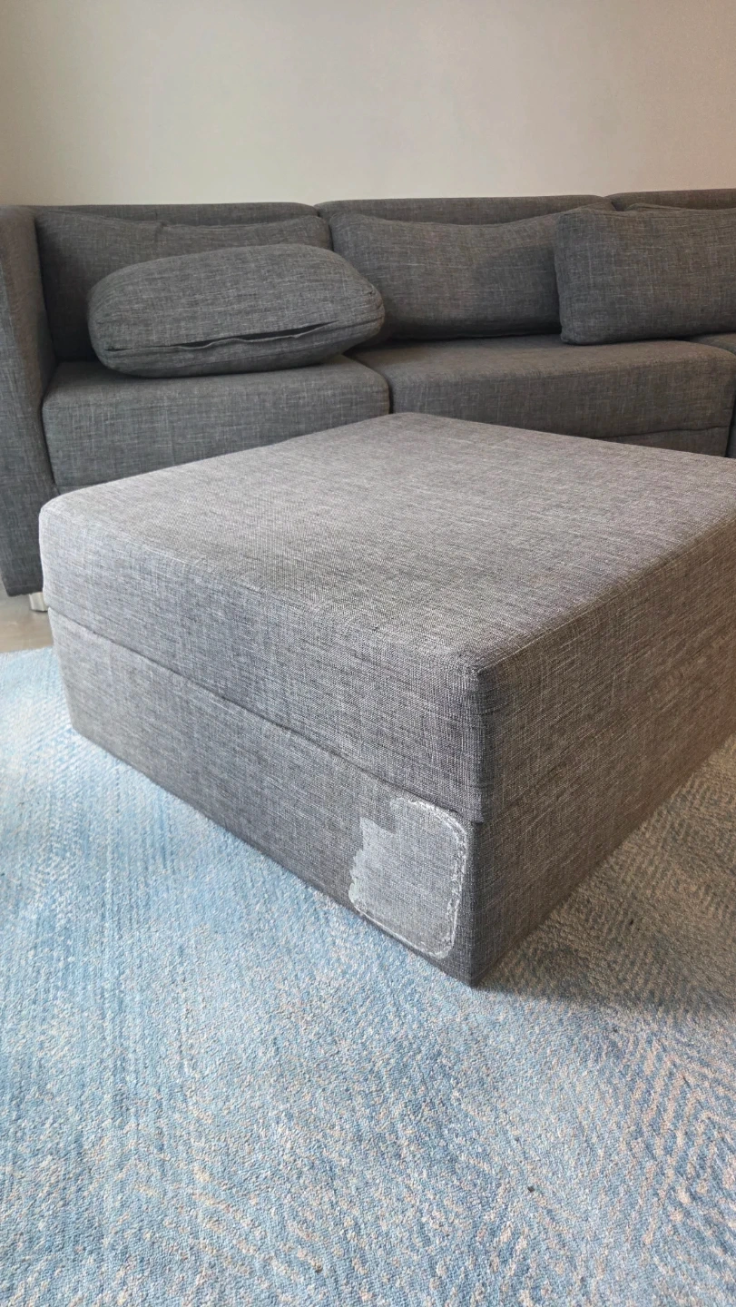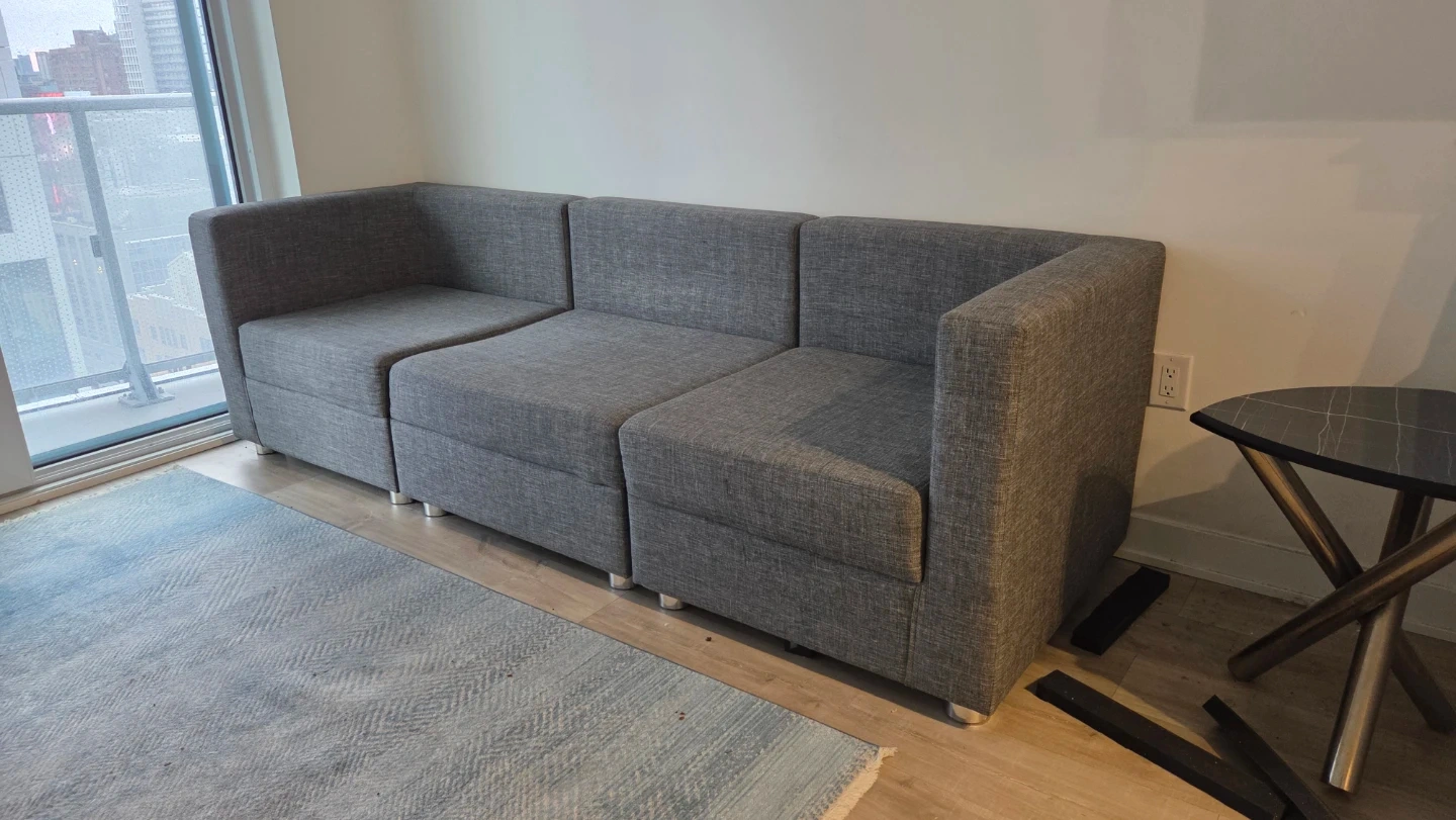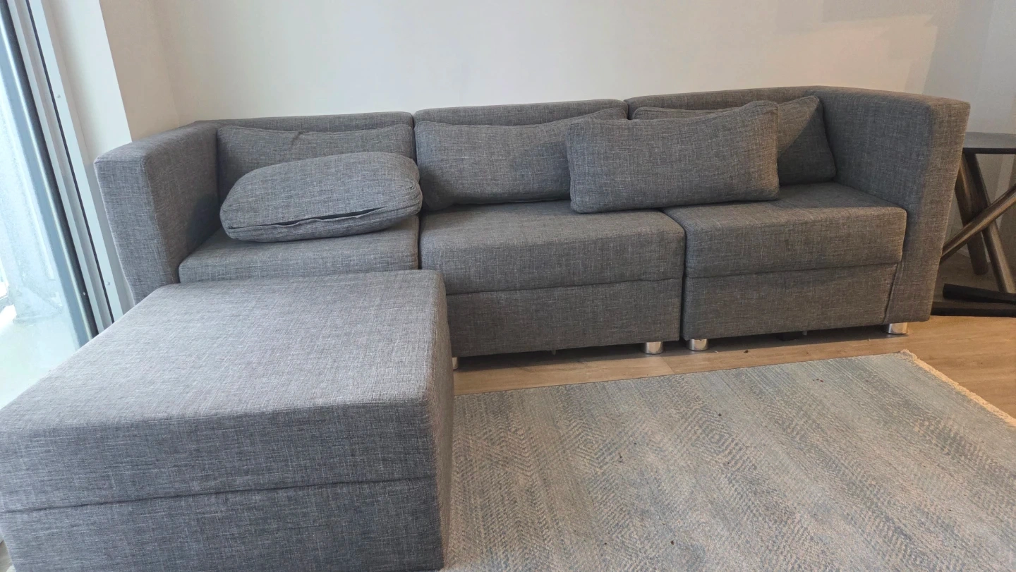 Modular grey sectional sofa with multiple configurations. Includes a matching ottoman that can be used for extra seating or as a footrest. Upholstered in a durable, textured fabric. It's a great piece for any living space!