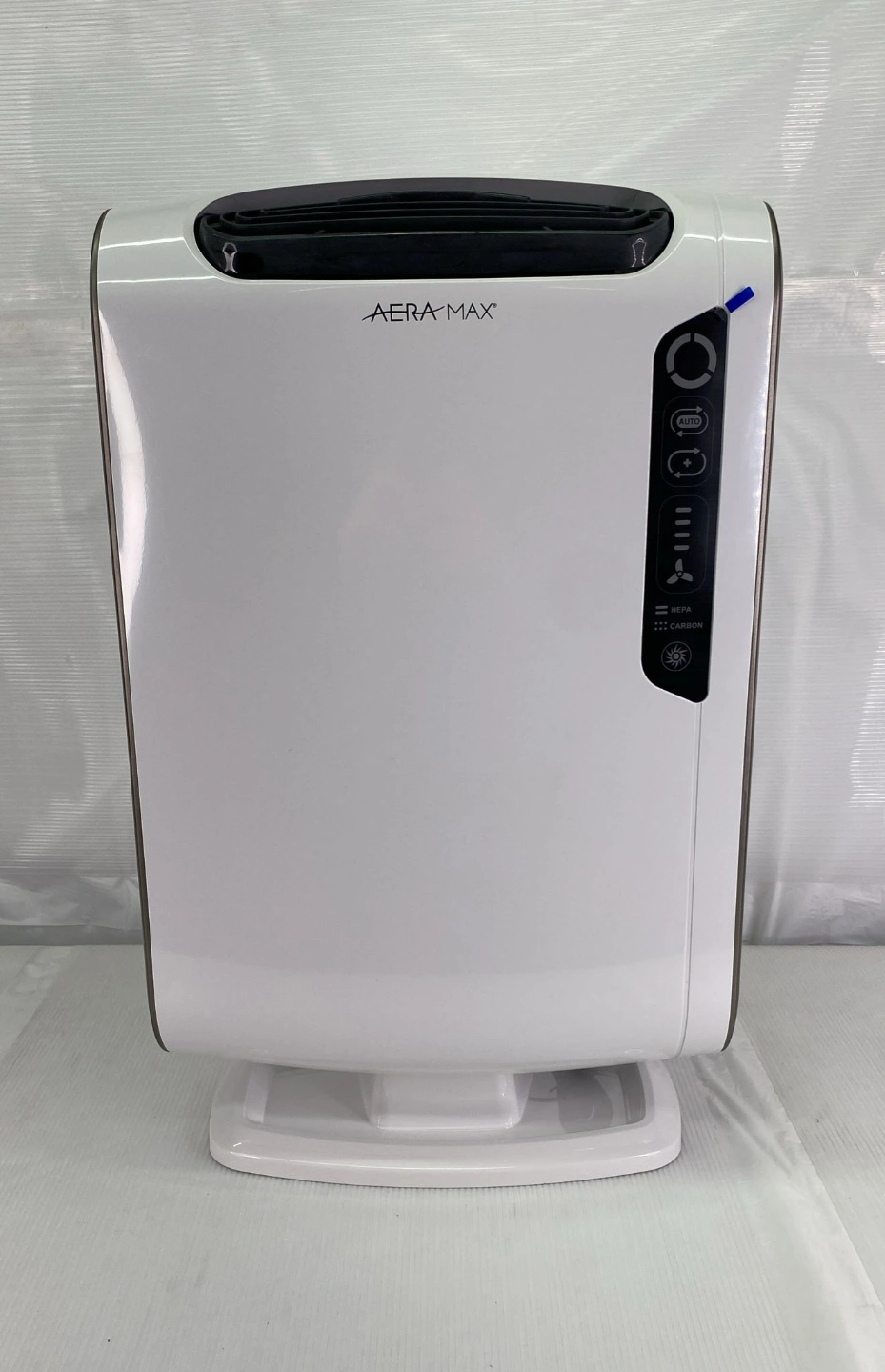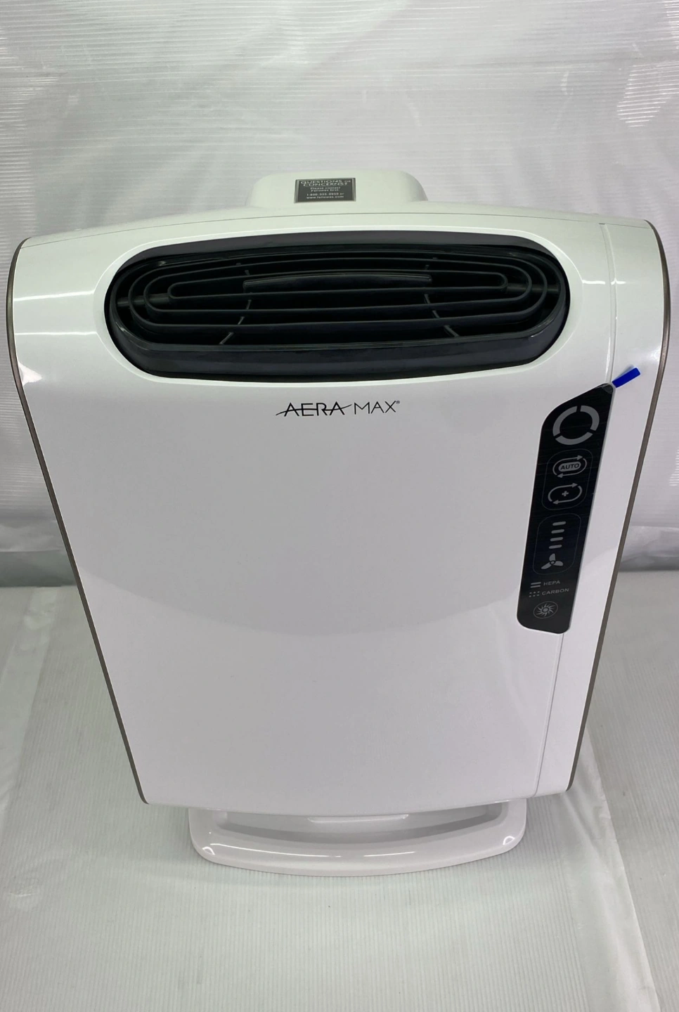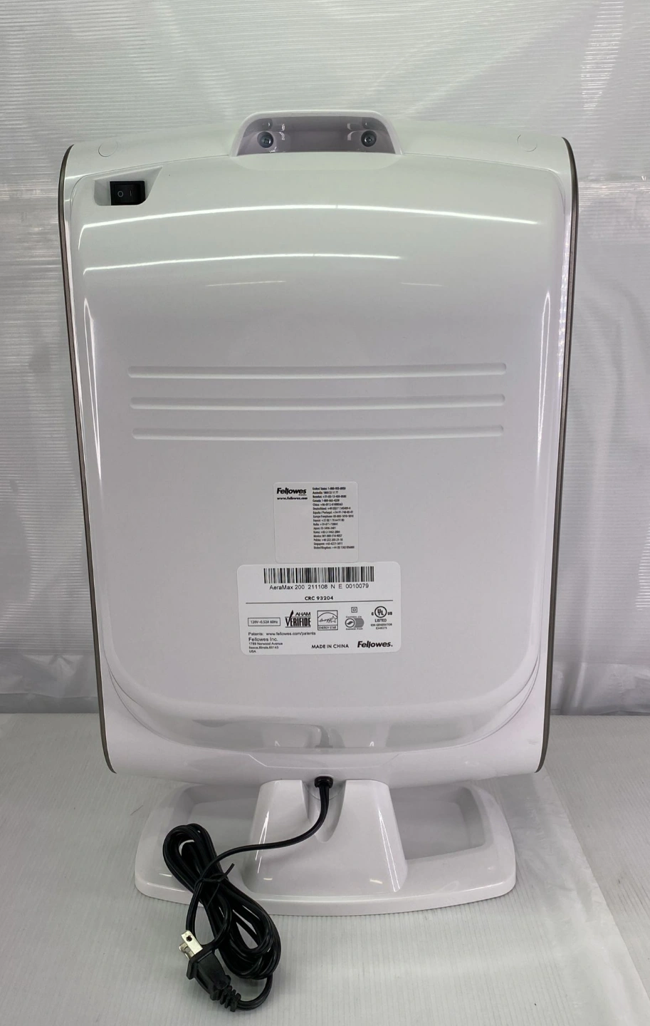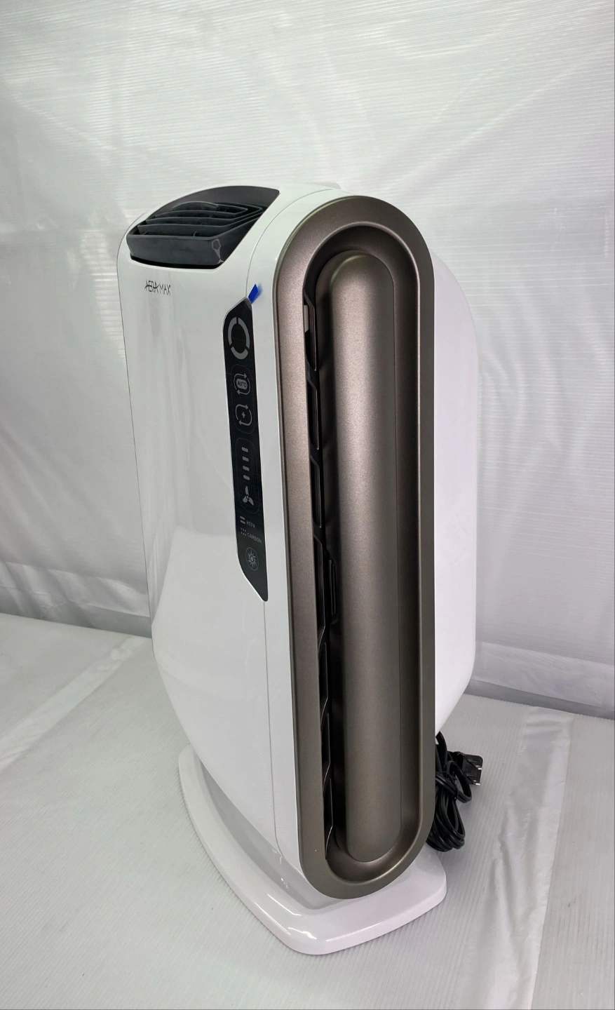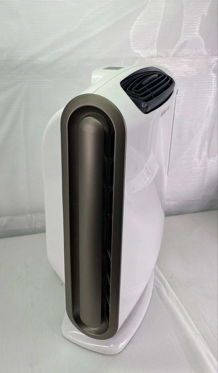 White and dark grey air purifier. Features HEPA filter. Includes power cord. Good for homes and offices.