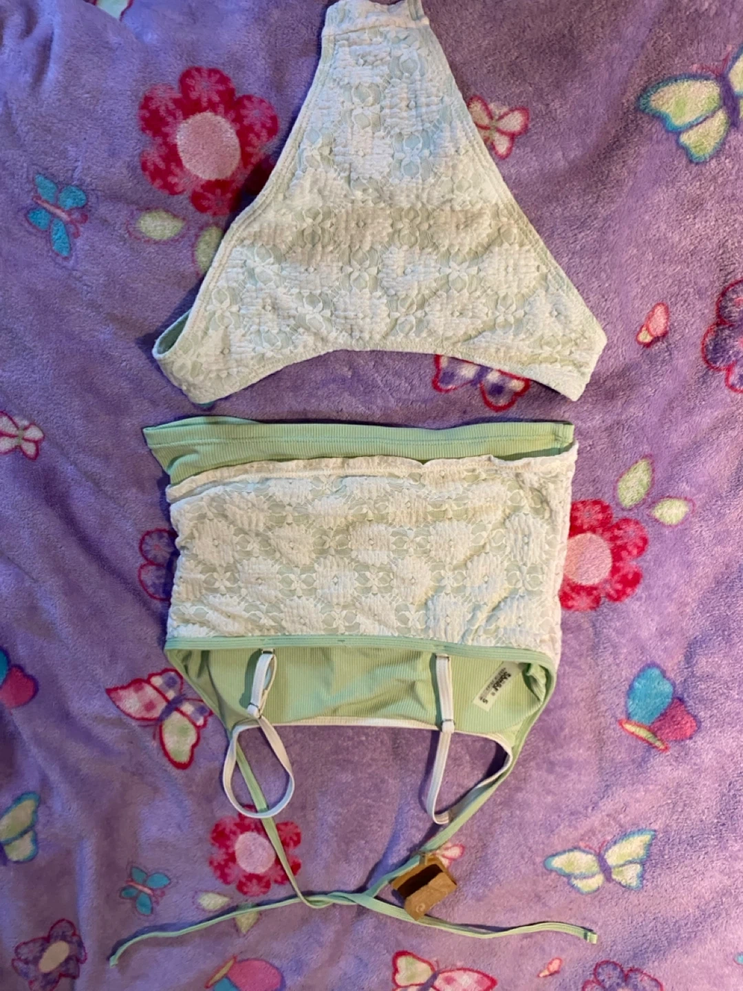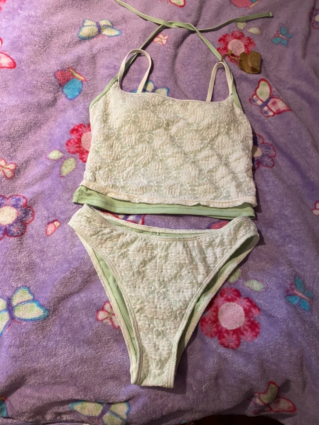 Selling a cute Aerie 2-piece bikini set in size small! The set features a light green and white floral pattern. Perfect for summer!