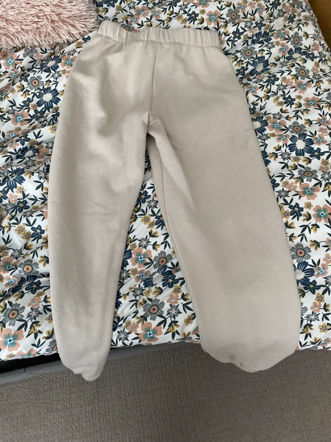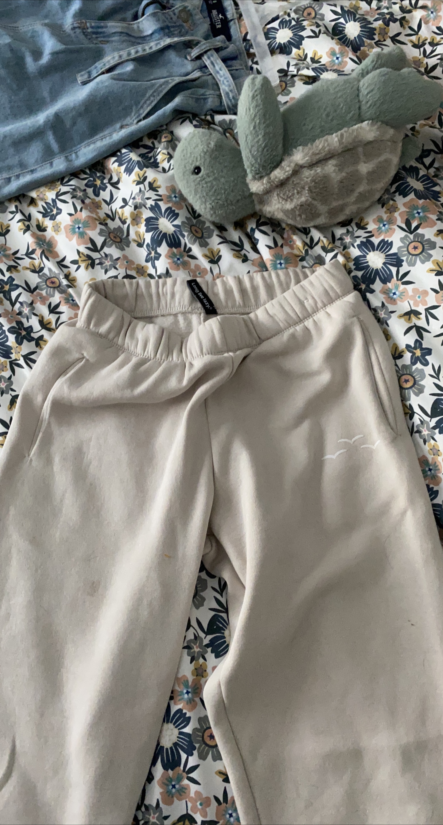 23Selling a pair of Aerie cream-colored joggers. They're super comfy and perfect for lounging around the house or running errands. These joggers have a relaxed fit and a drawstring waist for a customizable fit. There are some stains on the front.