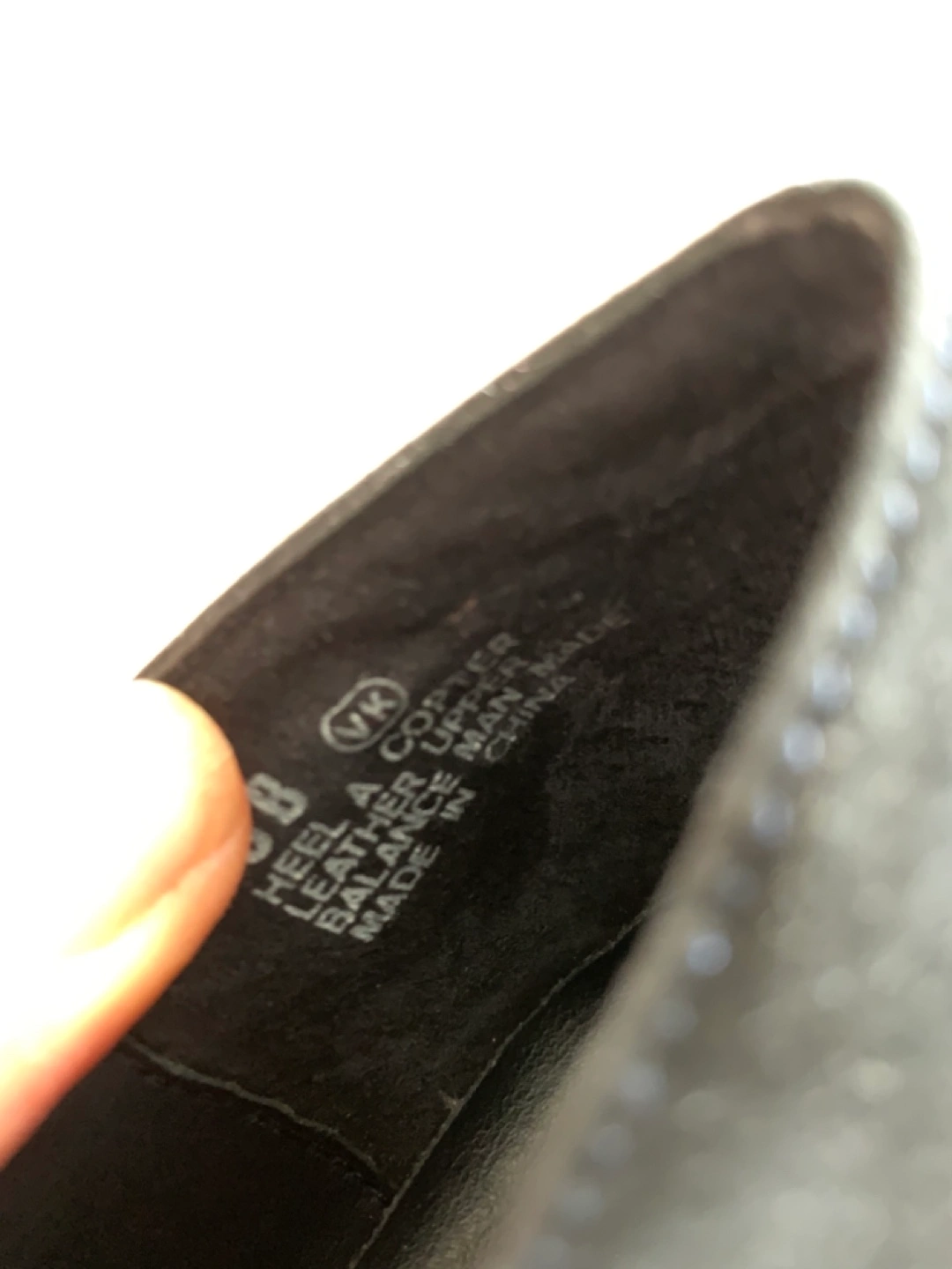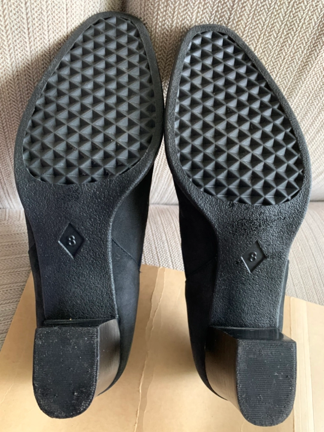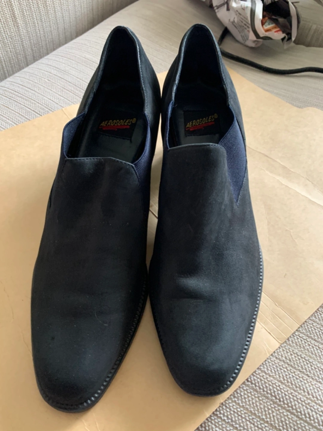 Pair of dark blue suede slip-on shoes. Features a block heel. Very Good condition.