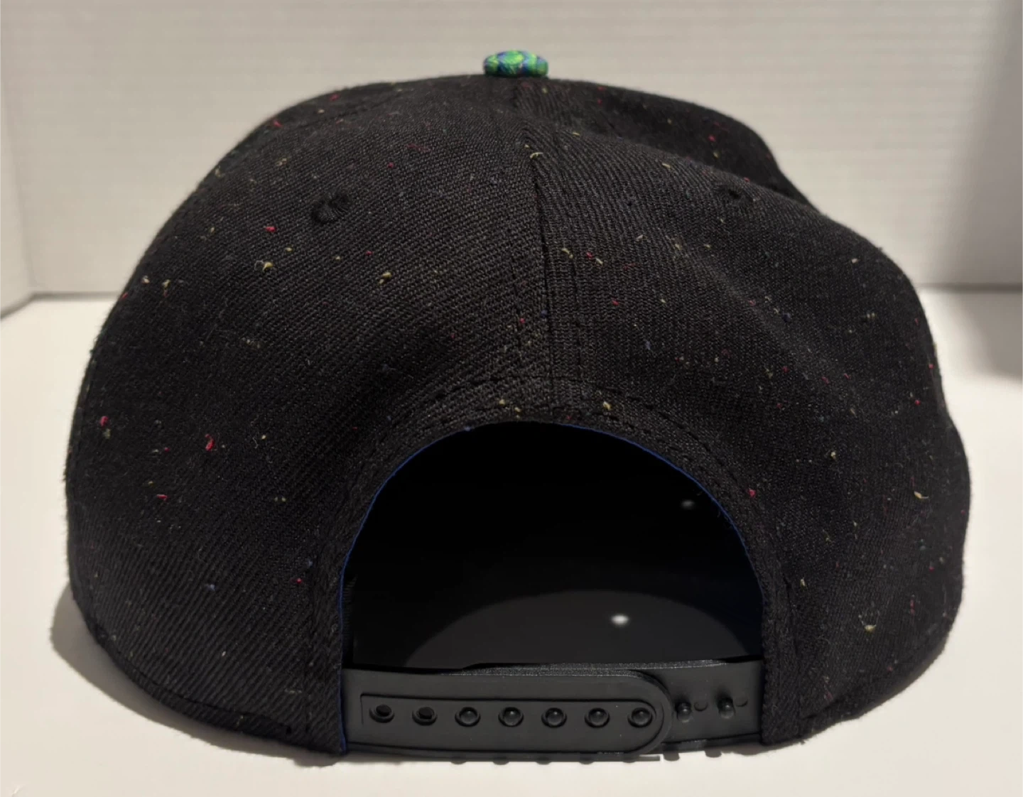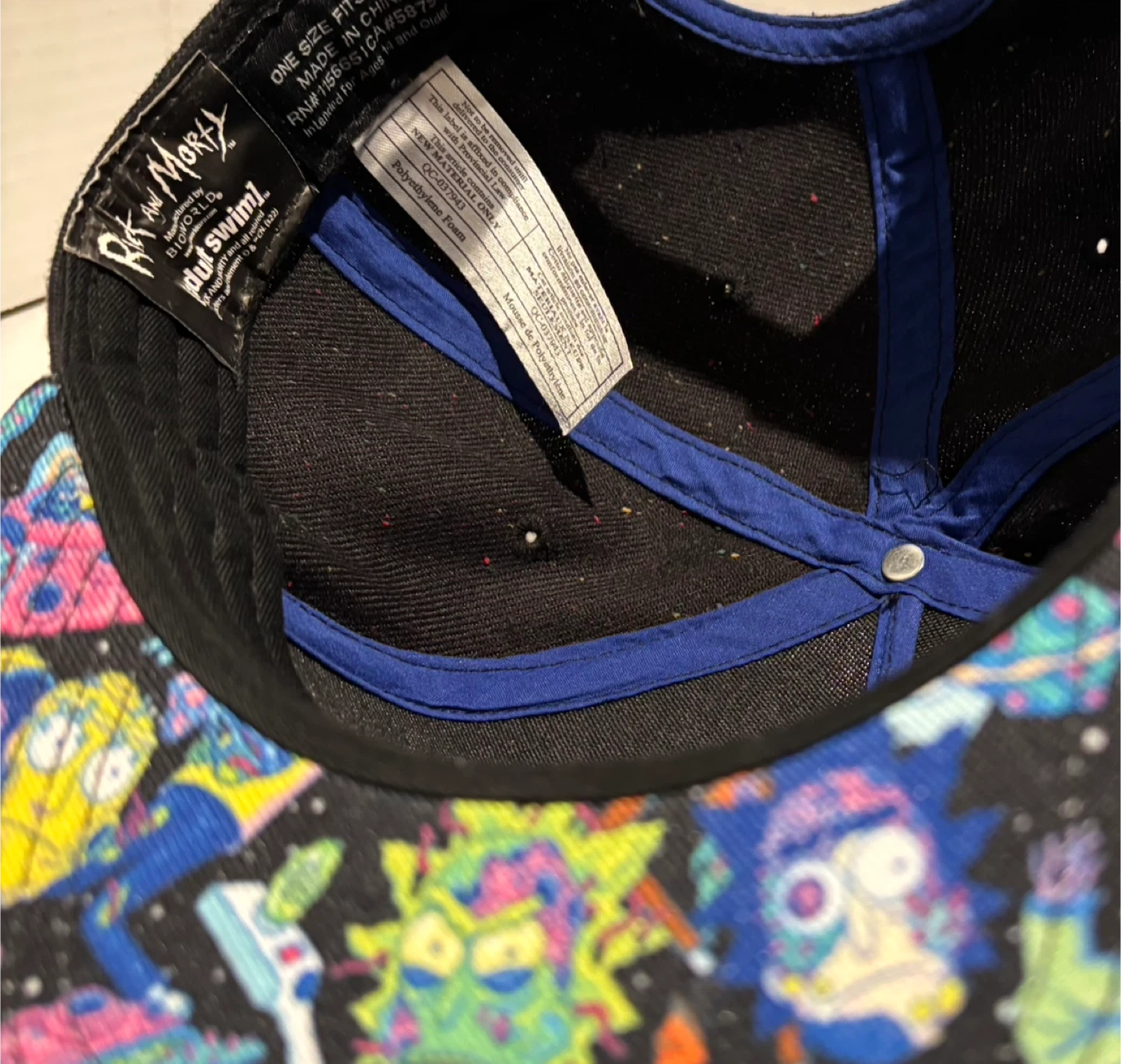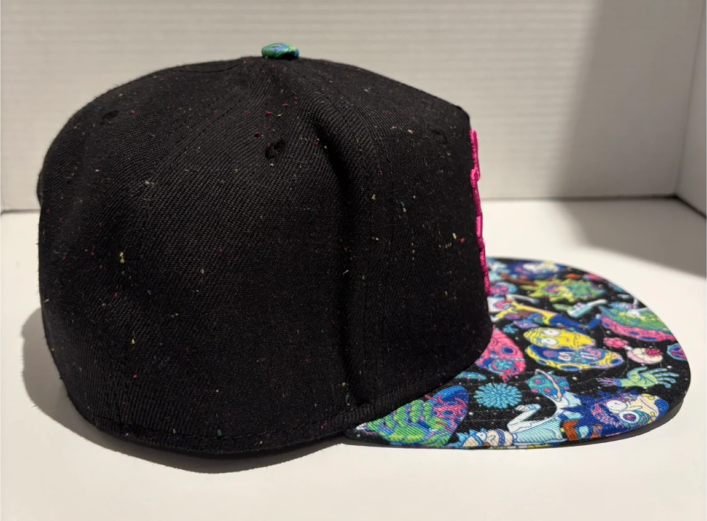 This is a black snapback hat featuring a colorful Rick and Morty graphic print on the brim and a Rick patch on the front. It's designed for one size fits most with an adjustable snap closure. The hat has a speckled black fabric with multi-coloured flecks throughout.
