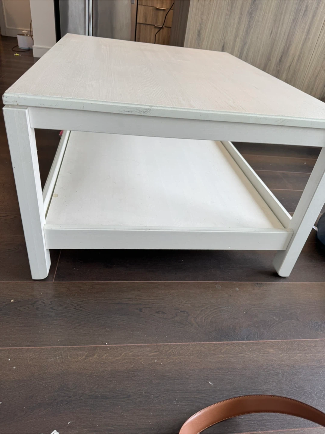 This is a white, square coffee table. It has a lower shelf for extra storage. It's a simple and practical piece for any living room. Its clean design fits most decor styles.