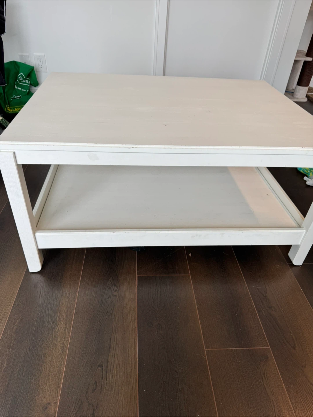 This is a white, square coffee table. It has a lower shelf for extra storage. It's a simple and practical piece for any living room. Its clean design fits most decor styles.