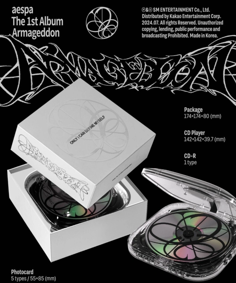 Selling aespa's 1st album, Armageddon! It comes in the original packaging. Package has been opened. Inside, you'll find: - Package: 174 x 174 x 80 (mm) - CD Player: 142 x 142 x 39.7 (mm) - CD-R: 1 type - Photocard: 5 types / 55 x 85 (mm) serious inquiries only