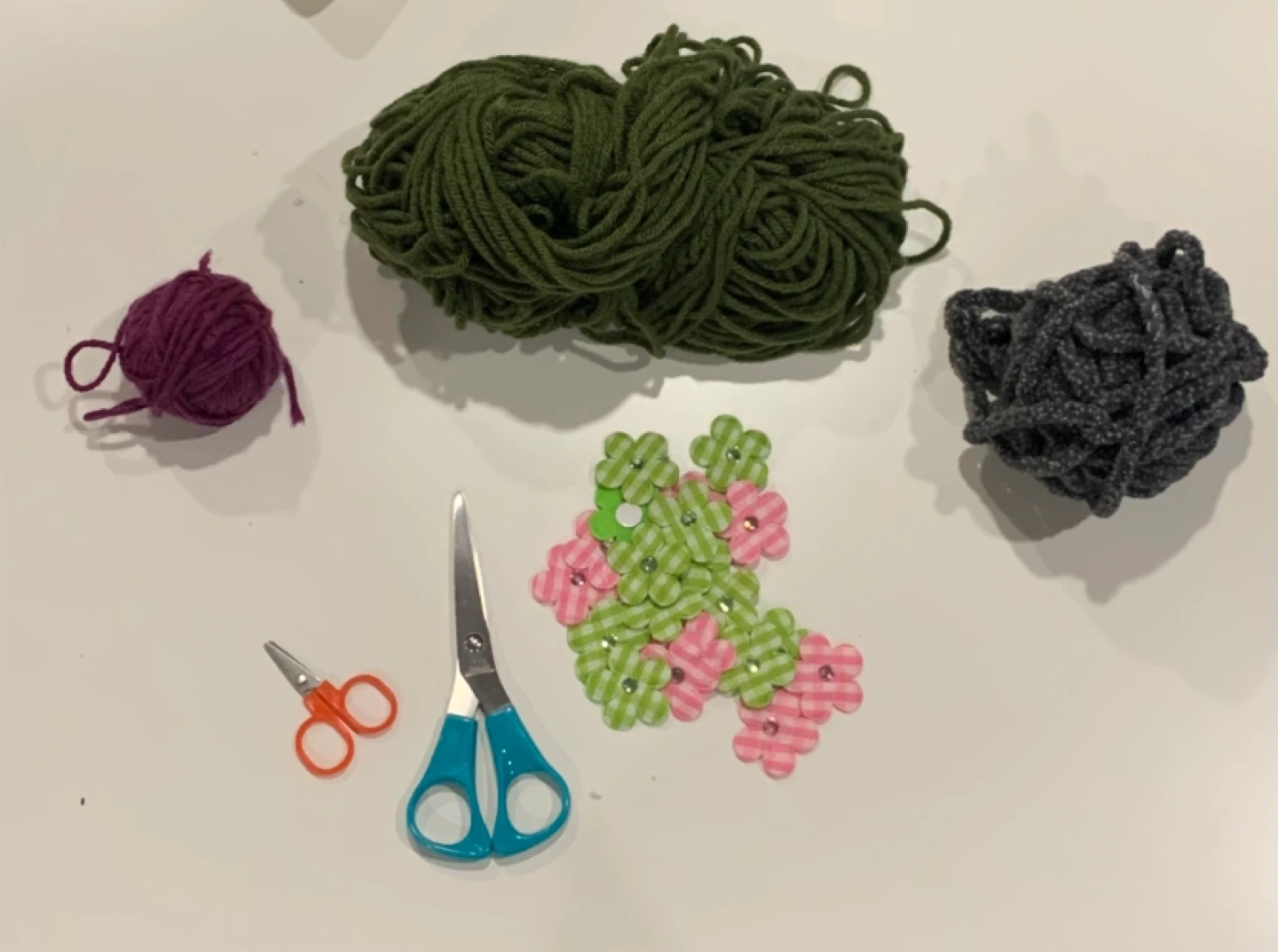 Selling various crafting supplies including yarn in green, purple and grey, scissors and flower embellishments