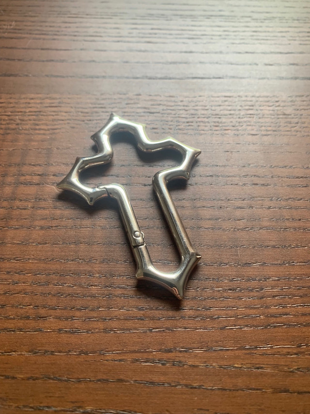 This unique cross belt clip is a stylish accessory that adds a unique touch to any outfit. It's in great shape and ready to clip onto your favourite belt or bag. The clip is sturdy, ensuring your items stay secure. asking $10. If the ad's up, it's available, ready to find a new home!