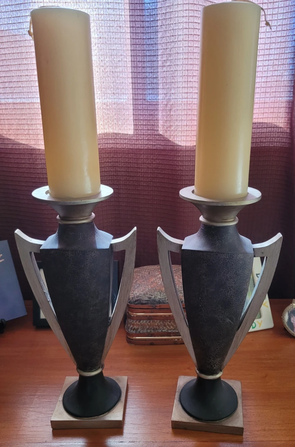 A pair of unique decorative candlesticks with a dark, textured finish and silver accents. These hold tall pillar candles and have a unique trophy-like design on square wooden bases. They're perfect for adding a dramatic touch to any room's decor.