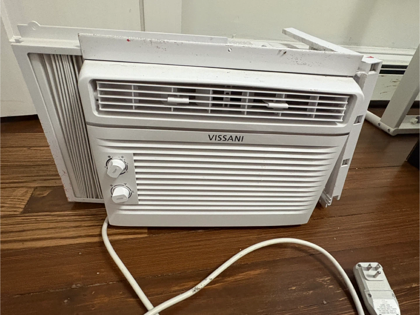 This VISSANI window air conditioner is white. It has adjustable fan speeds and cooling settings with two control knobs. It's designed for window installation.