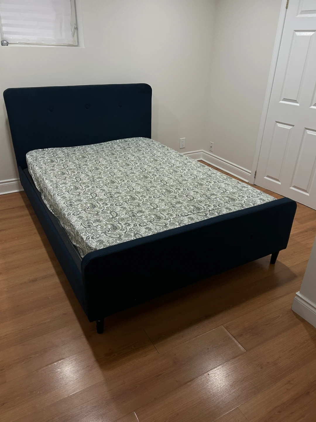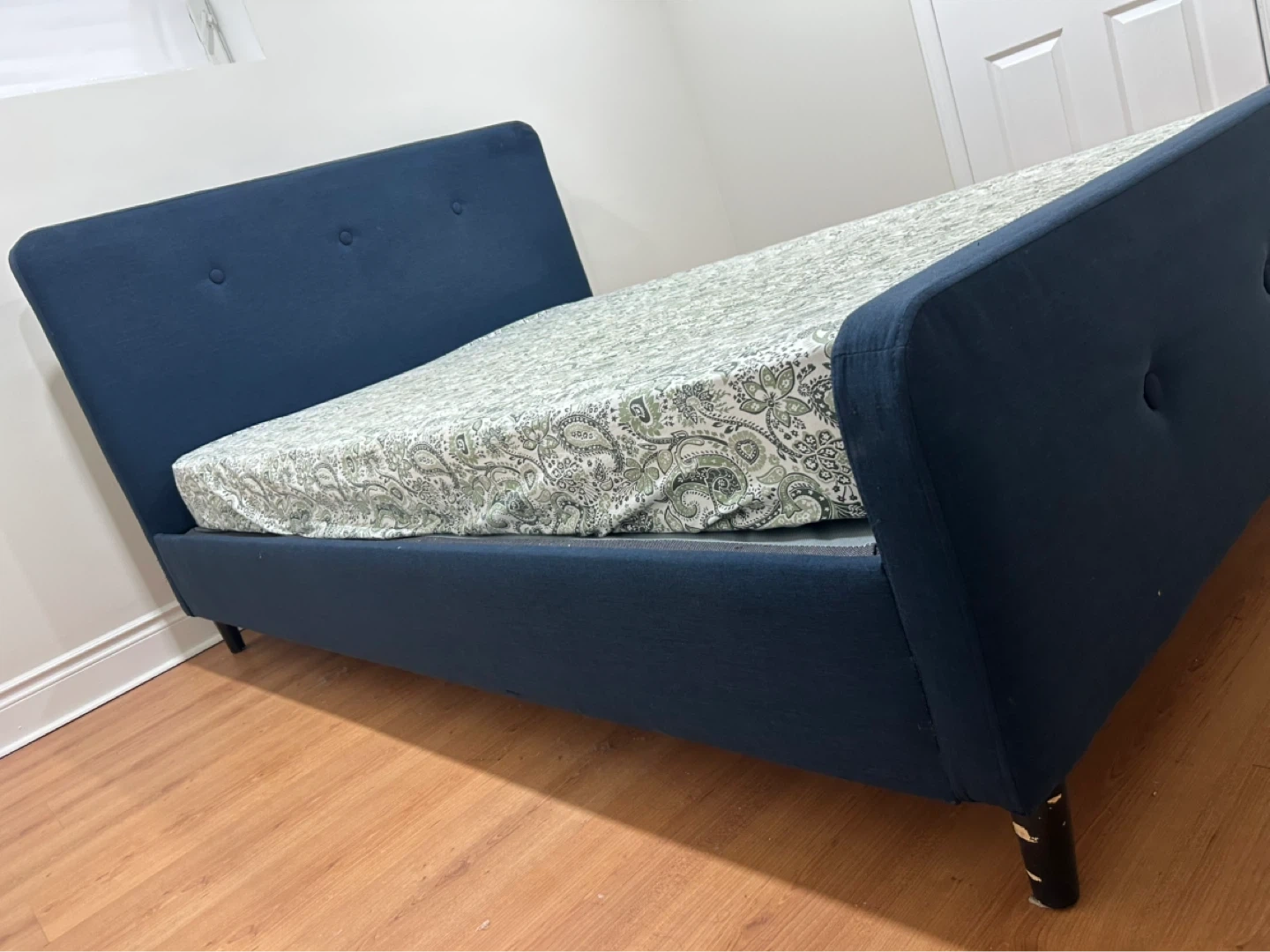 Used, but still in great condition. Mattress has some stains (can be deep cleaned, or you can take just the bed frame + headboard).