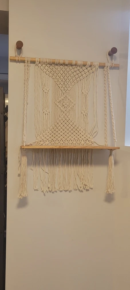 Selling a macrame wall hanging shelf. It's in great condition and would be a lovely addition to any room. The shelf is made of wood and the macrame is a cream colour. It's perfect for displaying small plants or other decorative items