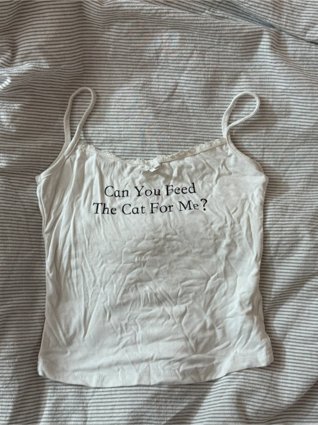 White ribbed tank top with a lace trim and a small bow. It has the text 'Can You Feed The Cat For Me?' printed on the front. Perfect for cat lovers!