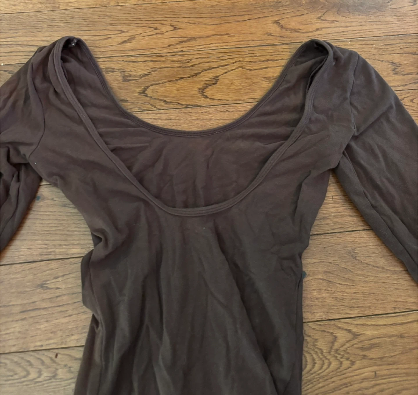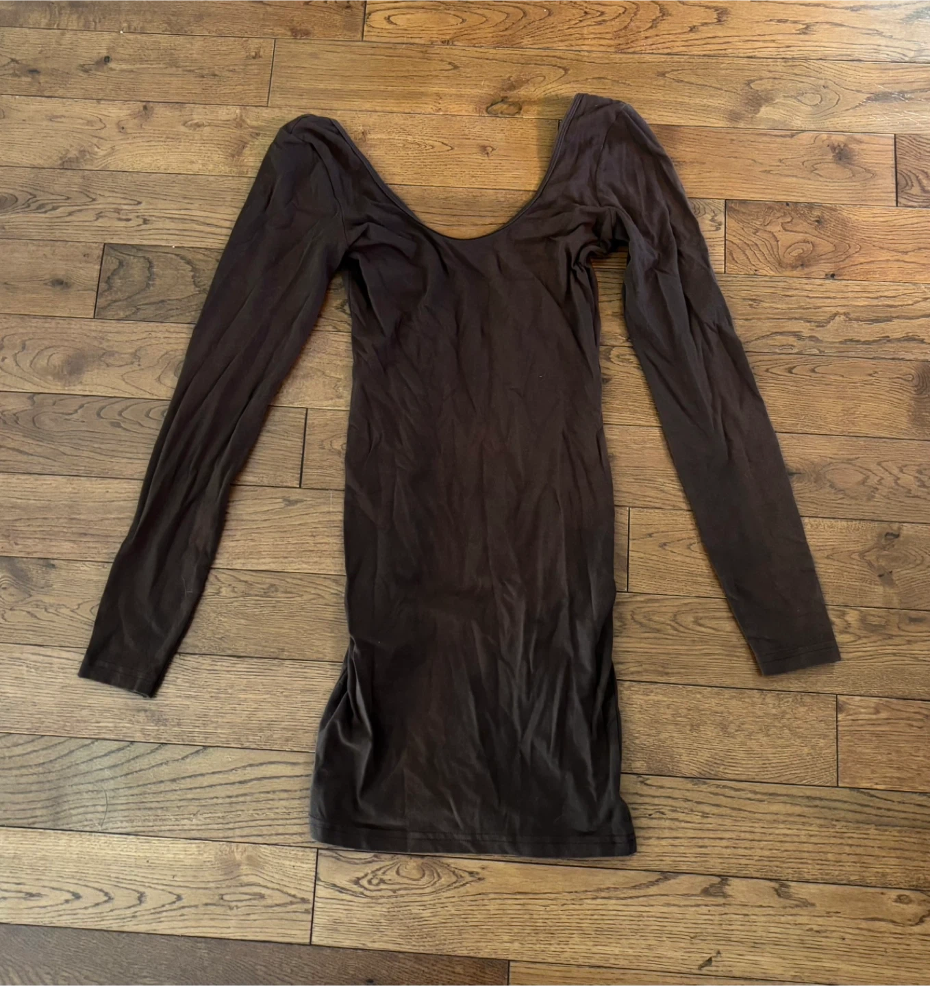 A long-sleeve dress in a dark brown colour. It's made from a stretchy, thin material. This dress has a scoop neckline and a low scoop back. Size small