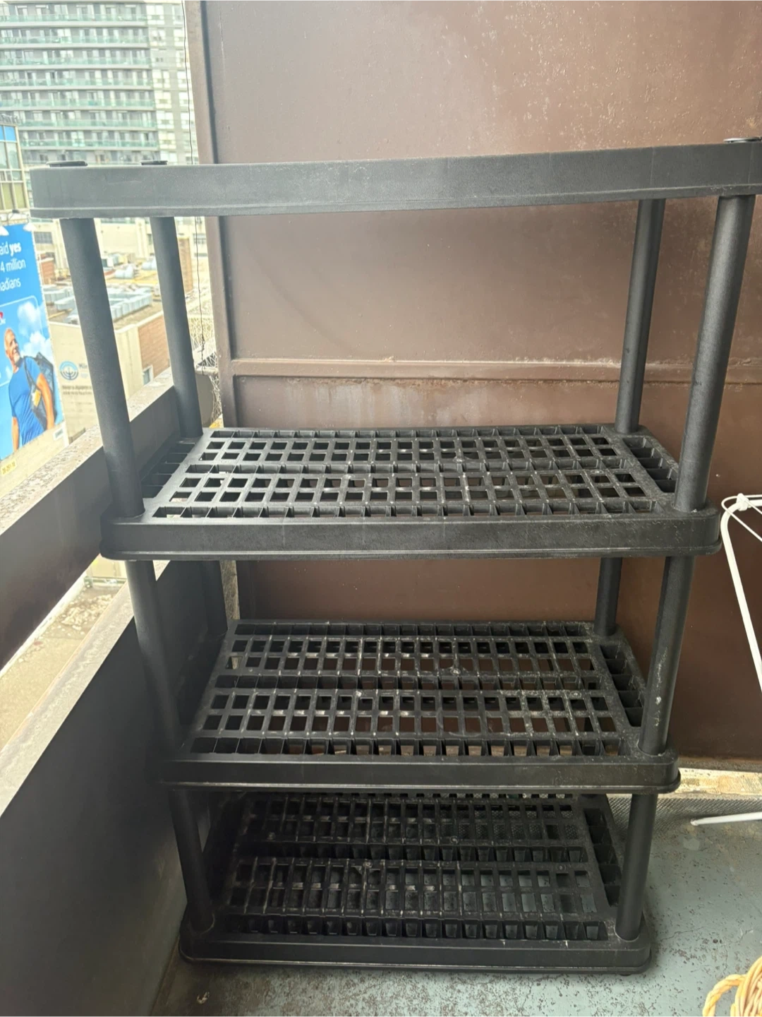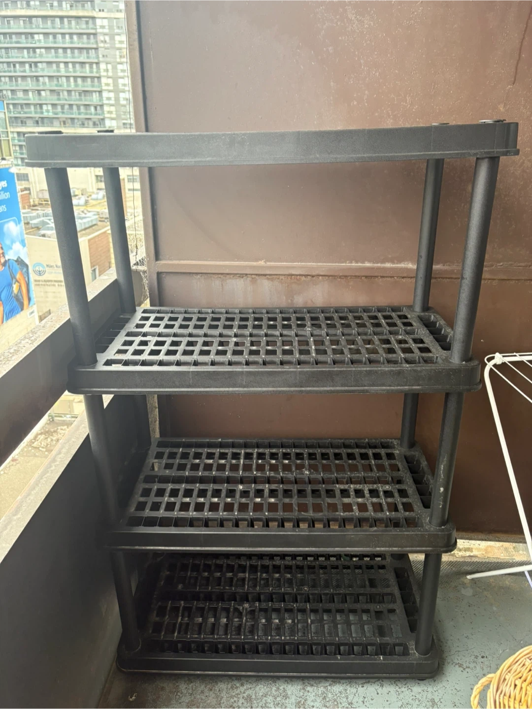 This is a four-tier plastic shelving unit in black. It's made of durable plastic and features open shelving. Great for organizing garages, basements, or storage areas.