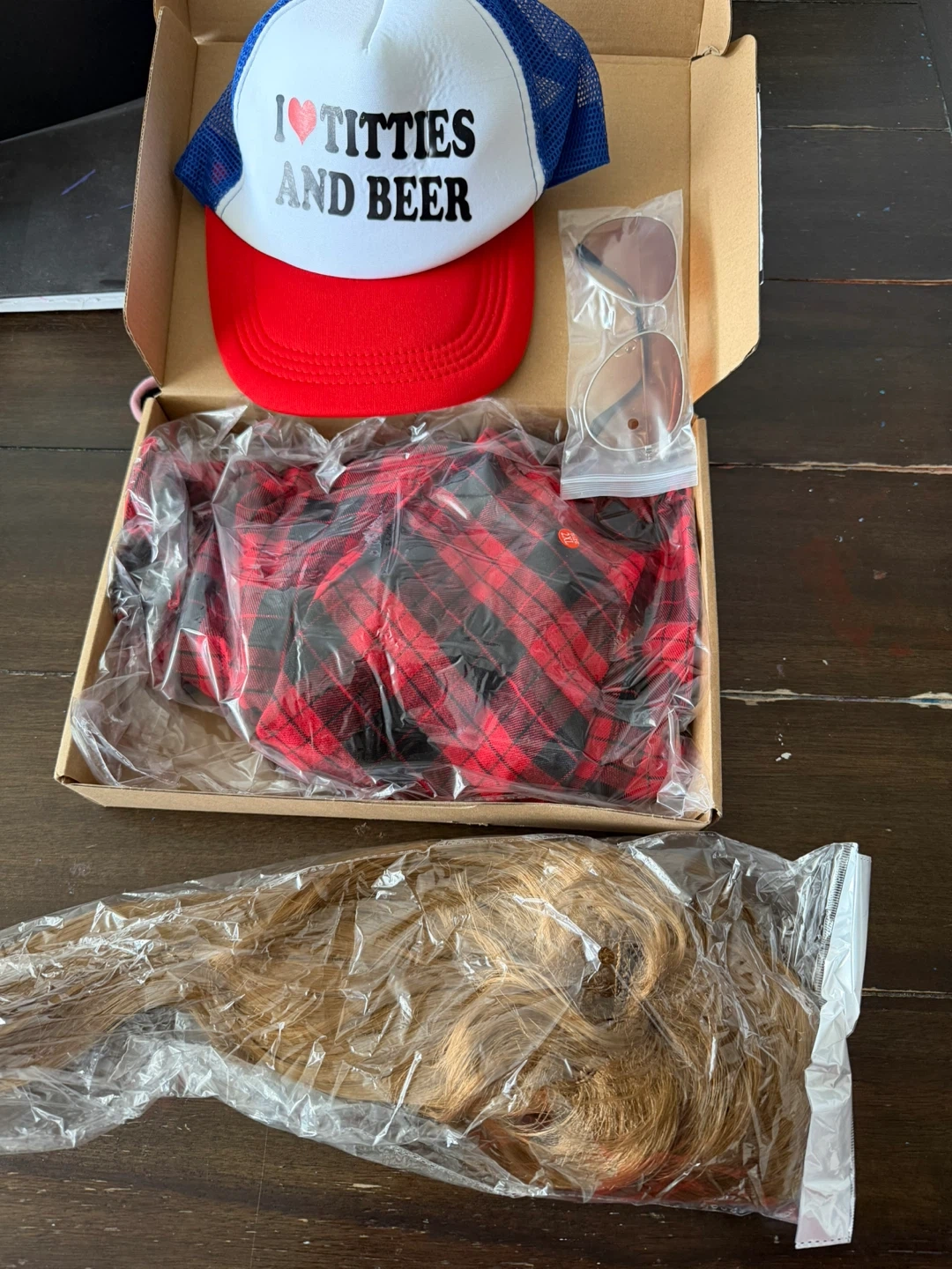 This costume set includes a blonde mullet wig, a red and black plaid sleeveless vest, aviator sunglasses, and a trucker hat with "I ❤️ TITTIES AND BEER" graphic. It's a fun 80s-themed ensemble for parties or events. The vest is a size XX-Large.