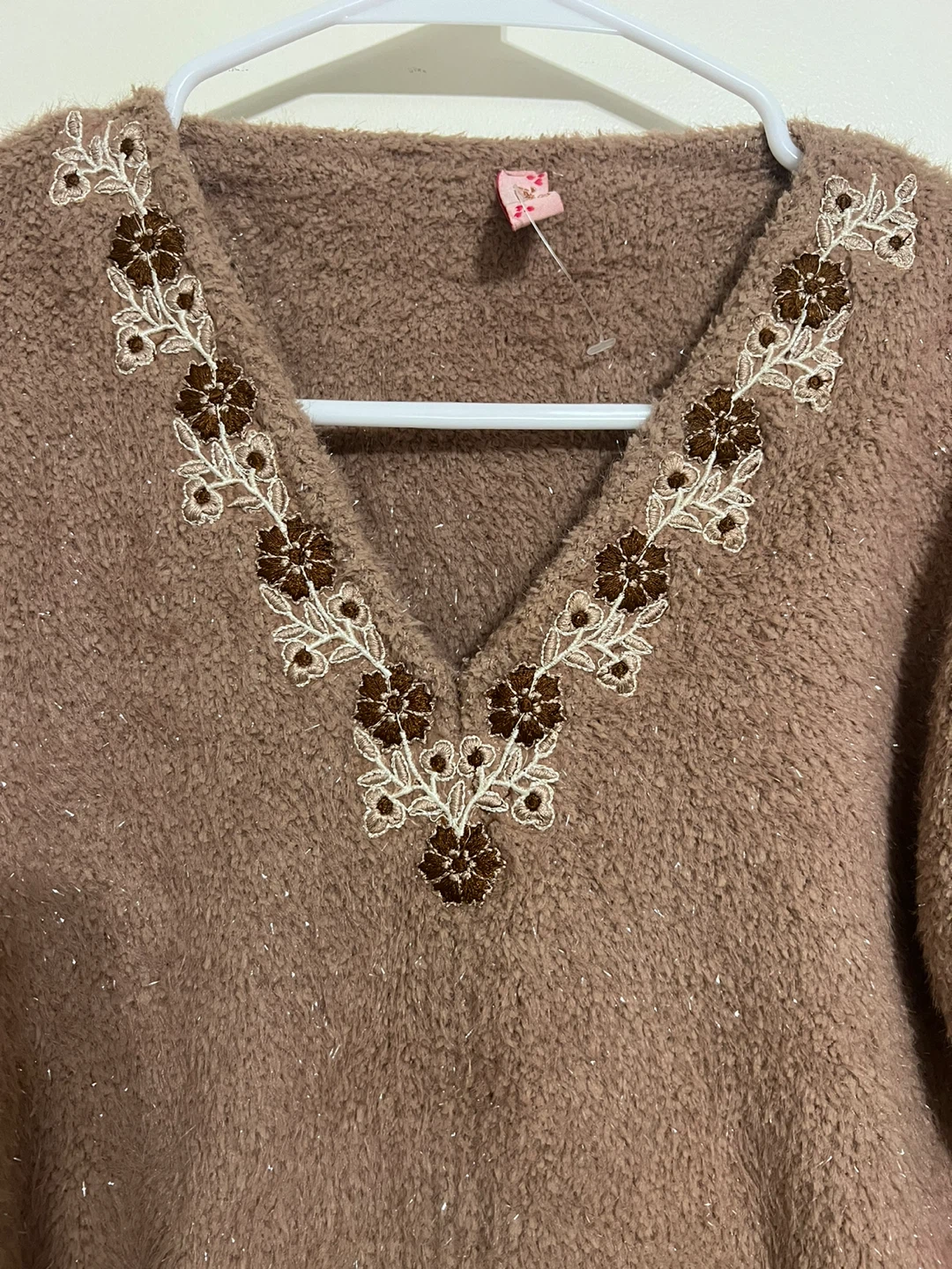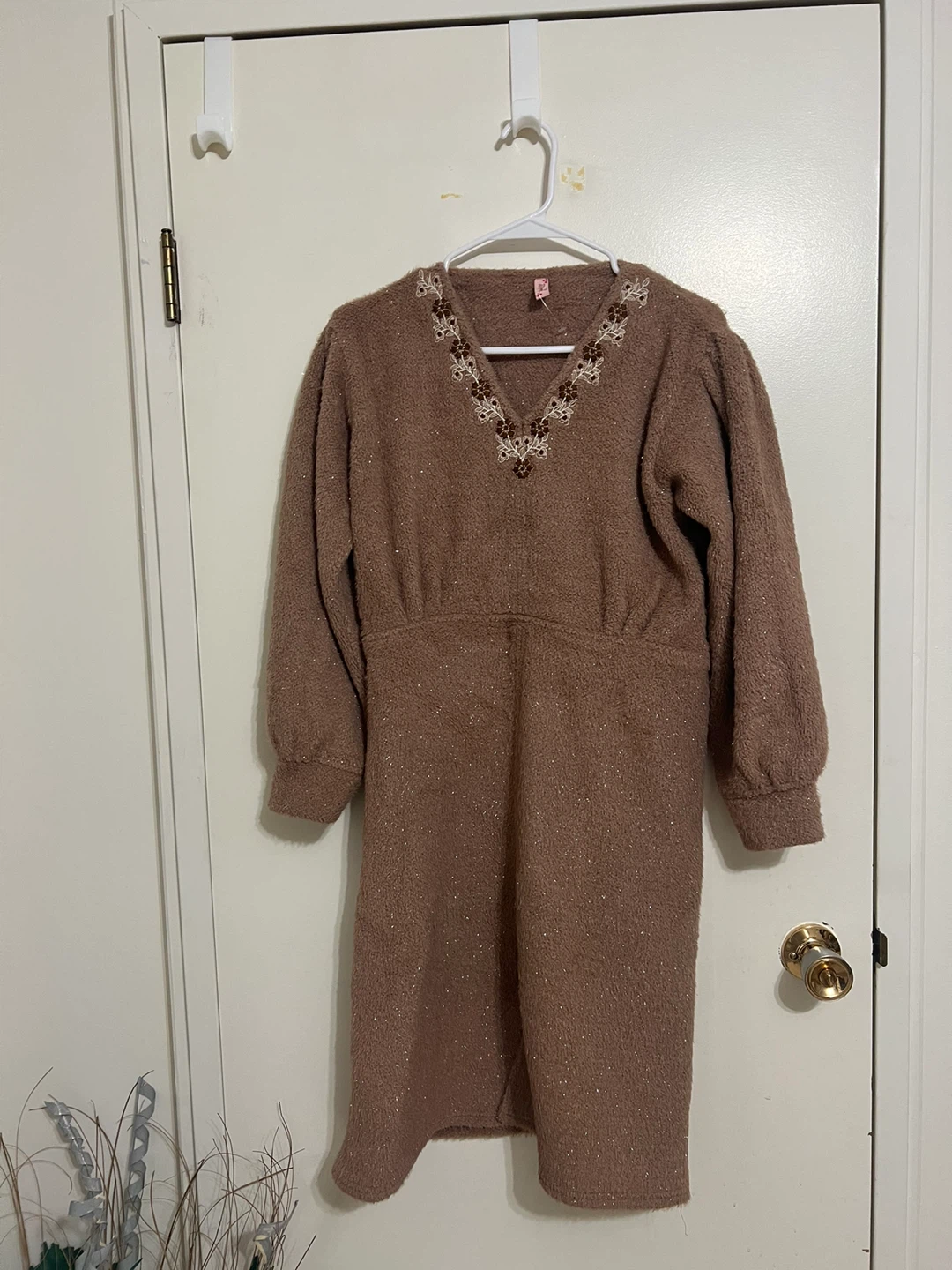 A lovely brown dress with floral embroidery around the neckline. It's in great condition and ready for a new wardrobe!