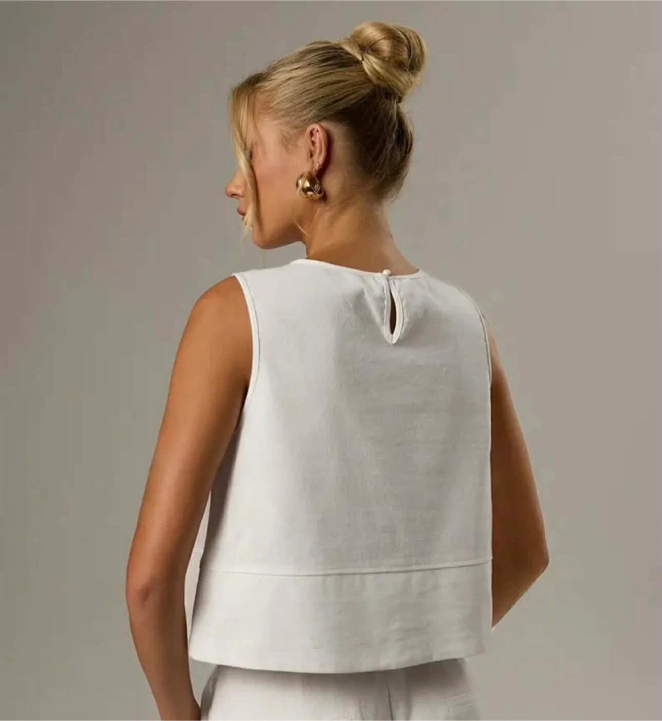 A chic white sleeveless cropped top. It features a round neckline and a slightly flared hem. The material appears to be a linen blend.