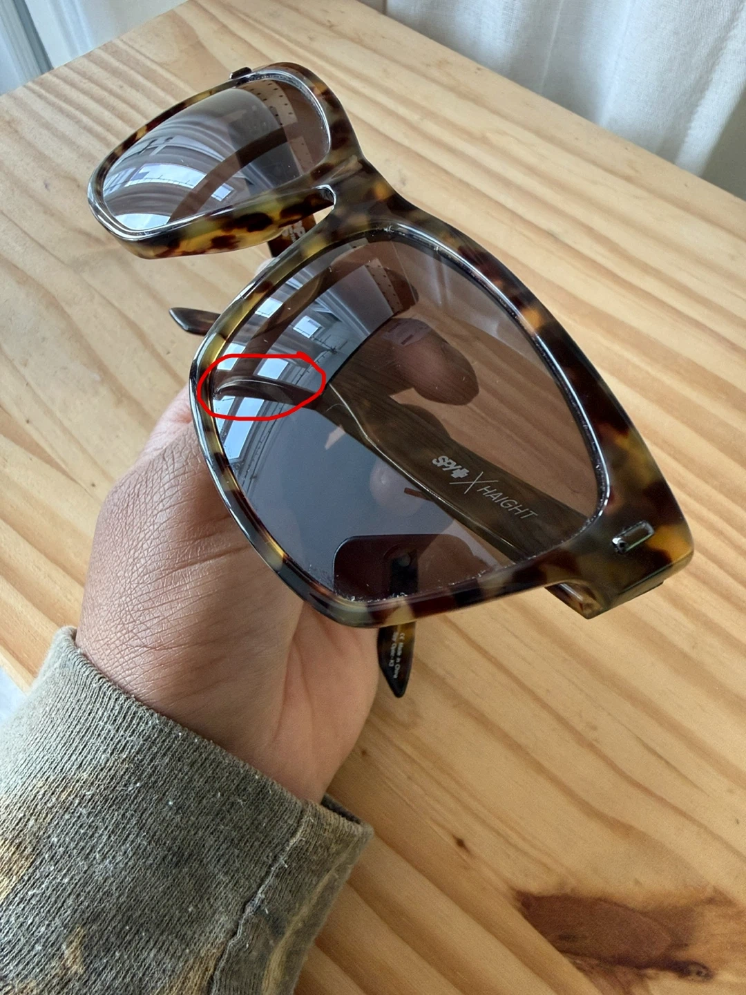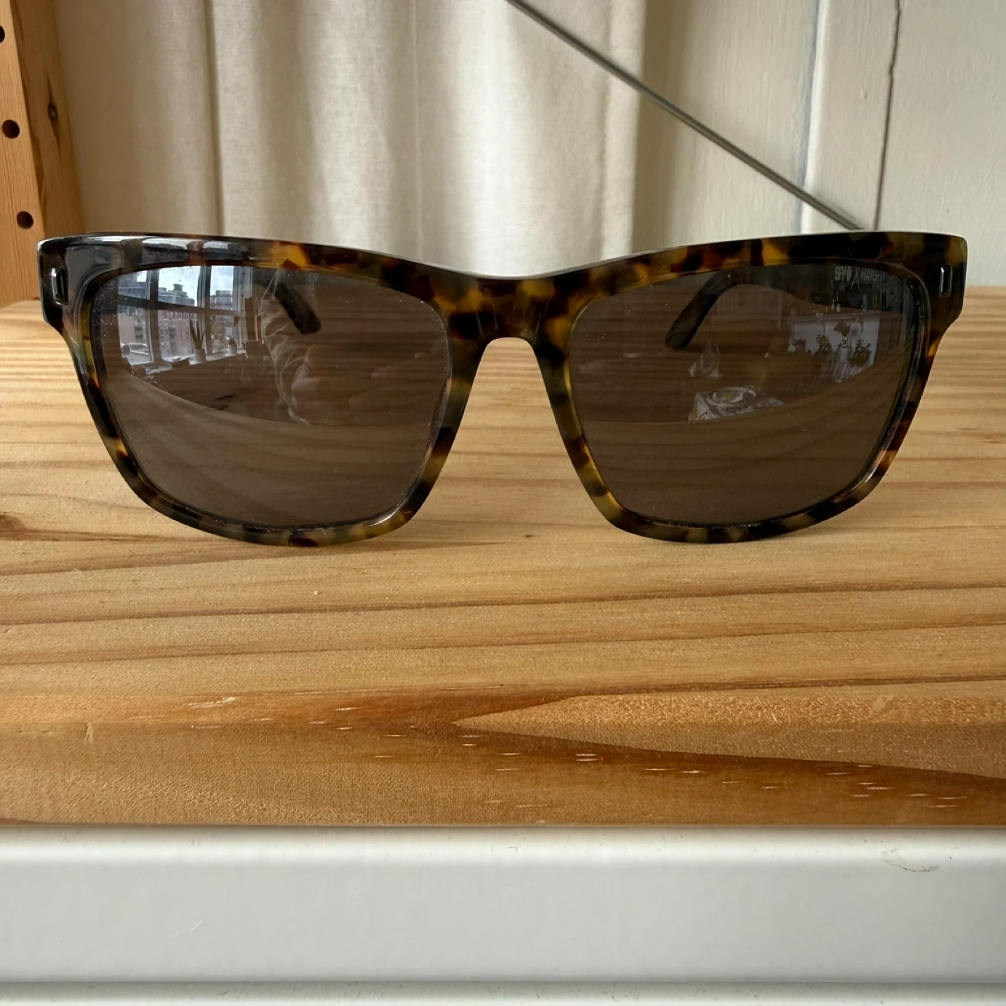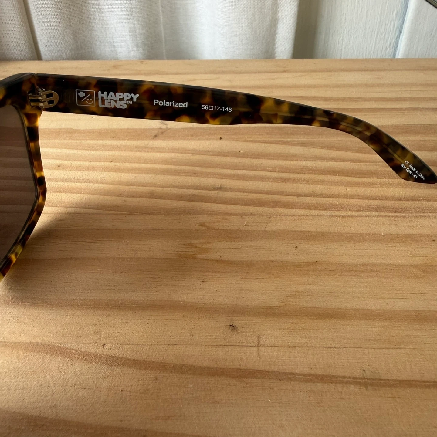 These SPY x HAIGHT sunglasses feature polarized lenses and a classic tortoise shell frame. They're great for sunny days and offer clear vision. Lens width is 58mm, bridge is 17mm, and temple length is 145mm.