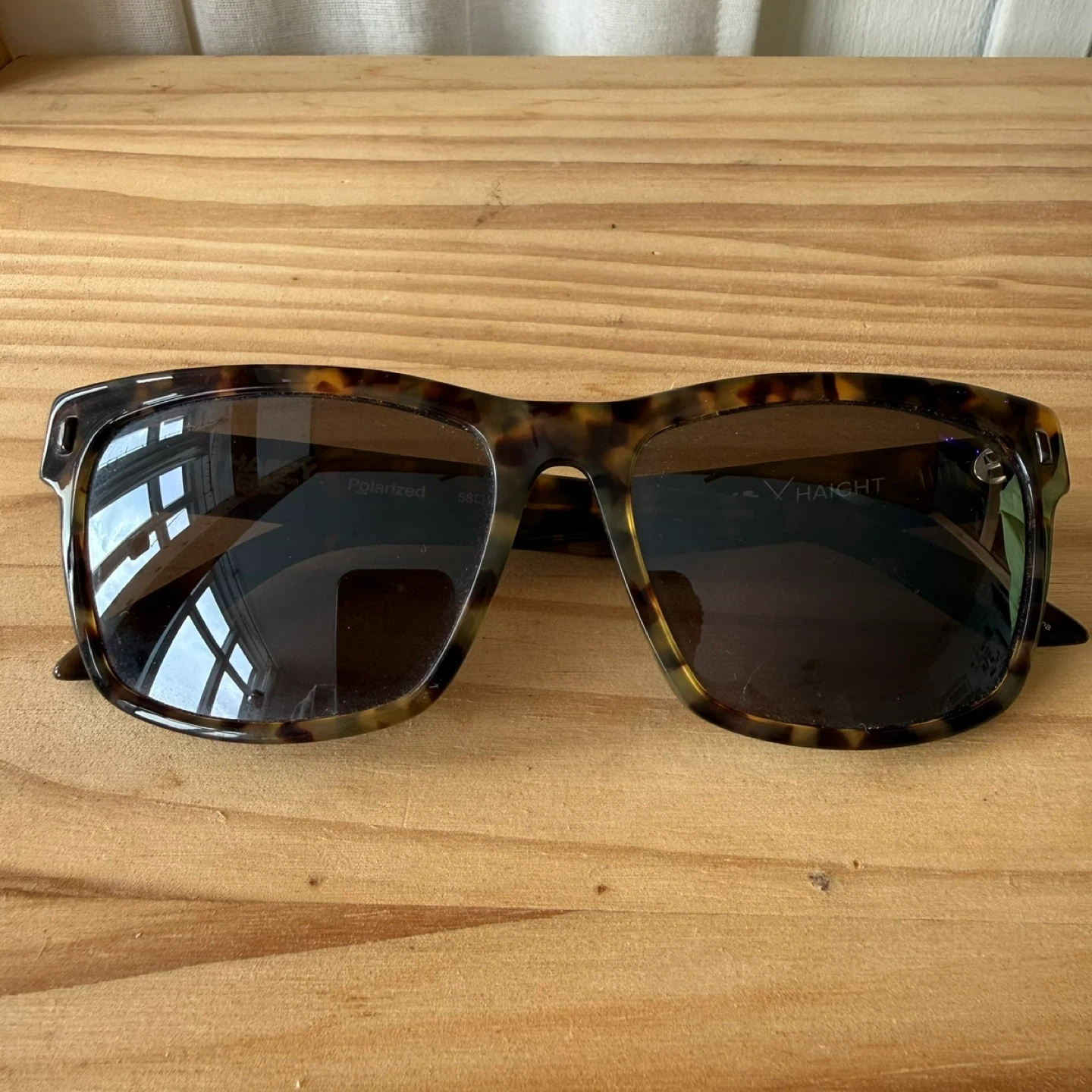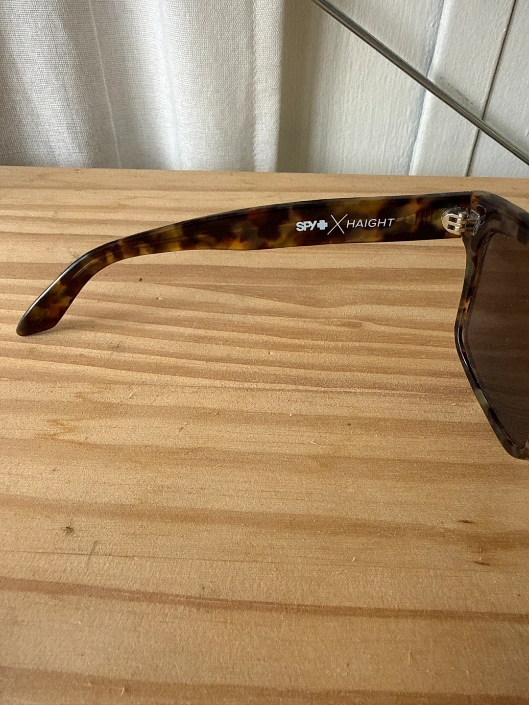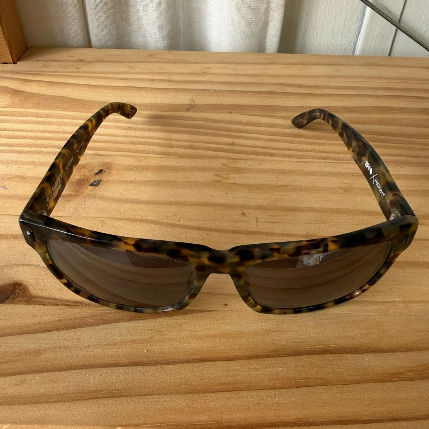These SPY x HAIGHT sunglasses feature polarized lenses and a classic tortoise shell frame. They're great for sunny days and offer clear vision. Lens width is 58mm, bridge is 17mm, and temple length is 145mm.