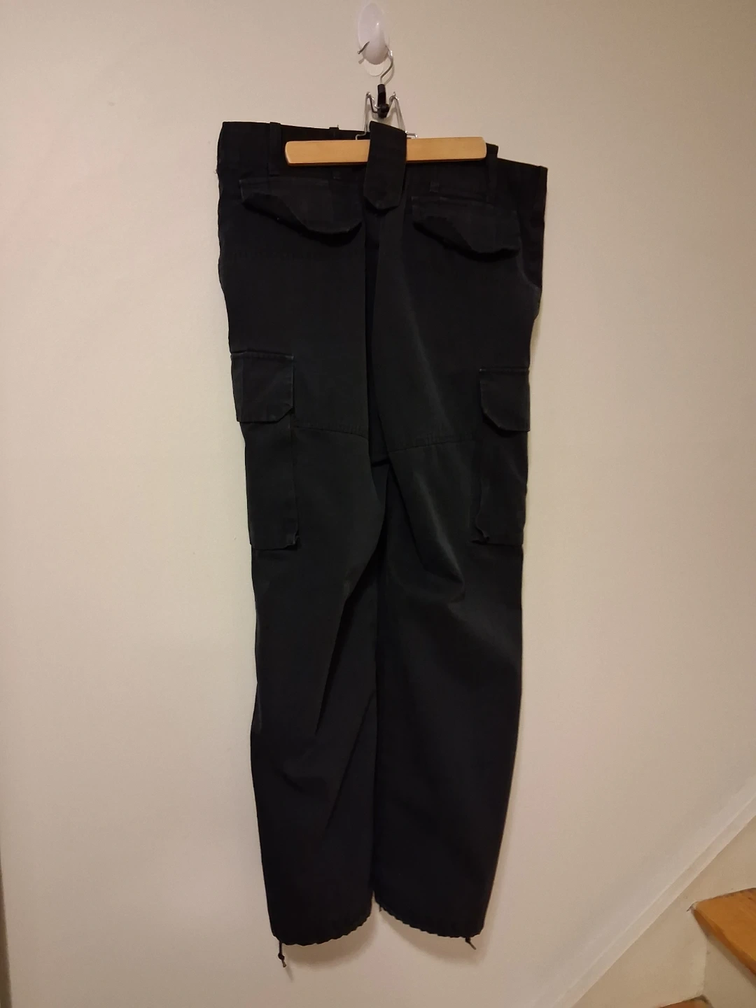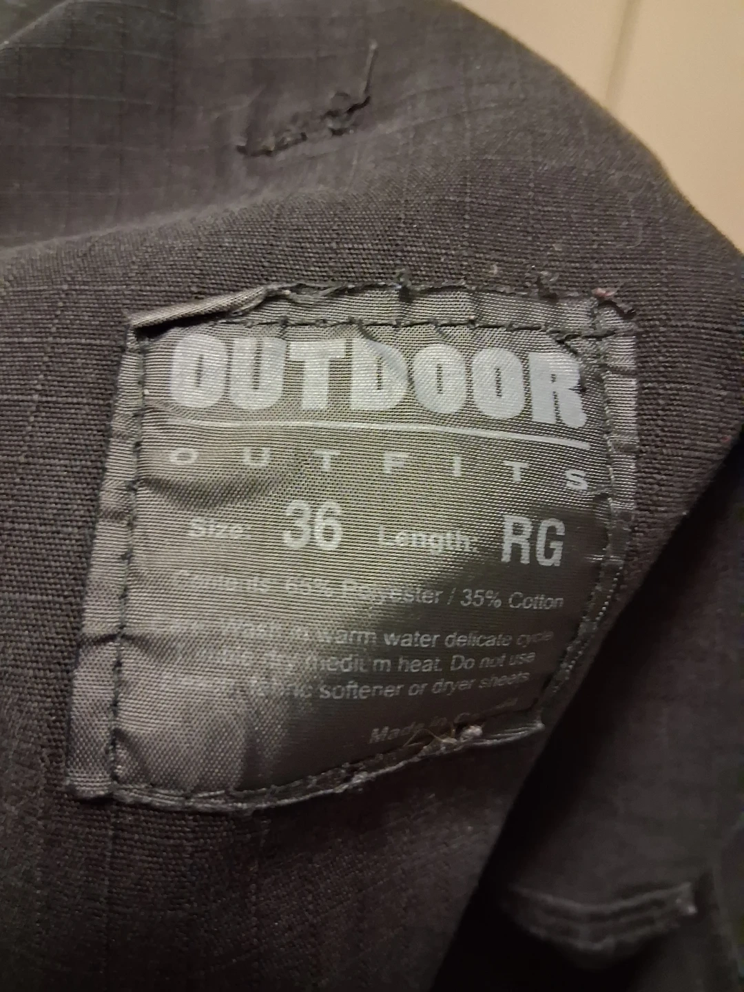 Outdoor Outfits cargo pants in black. Size 36 waist, regular length. Made from 65% Polyester and 35% Cotton blend. Features multiple cargo pockets.