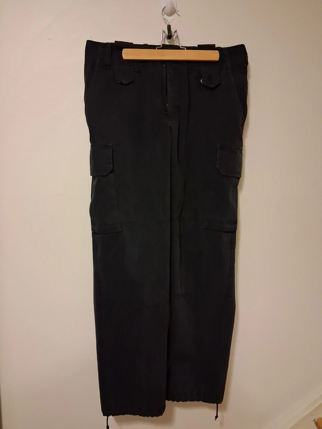 Outdoor Outfits cargo pants in black. Size 36 waist, regular length. Made from 65% Polyester and 35% Cotton blend. Features multiple cargo pockets.
