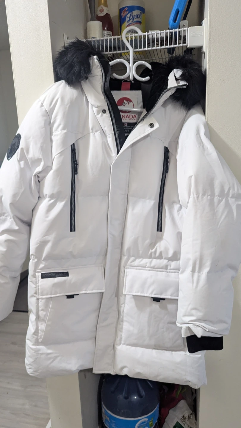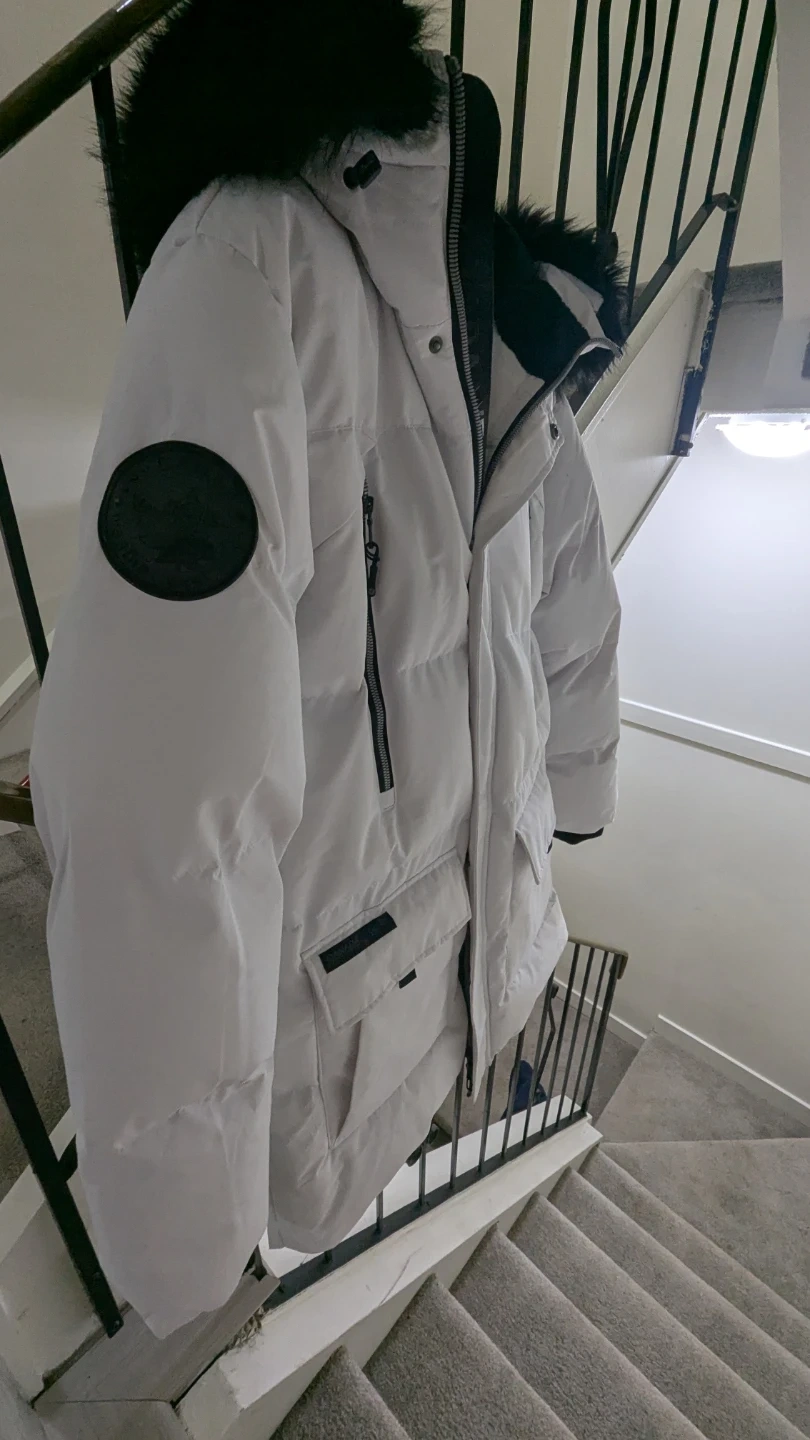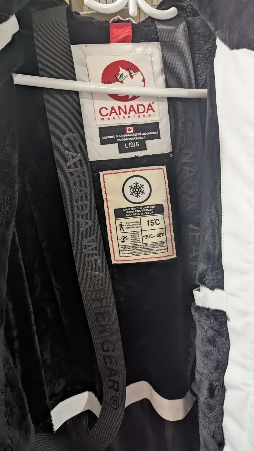 This Canada Weather Gear puffer jacket is white and features a black faux fur-lined hood. It's designed for winter warmth with a temperature rating down to -30°C. The jacket has a comfortable fleece-lined interior. It's a great choice for staying warm in cold weather! Over 499 in store it's just tight on me I use it only once very very clean