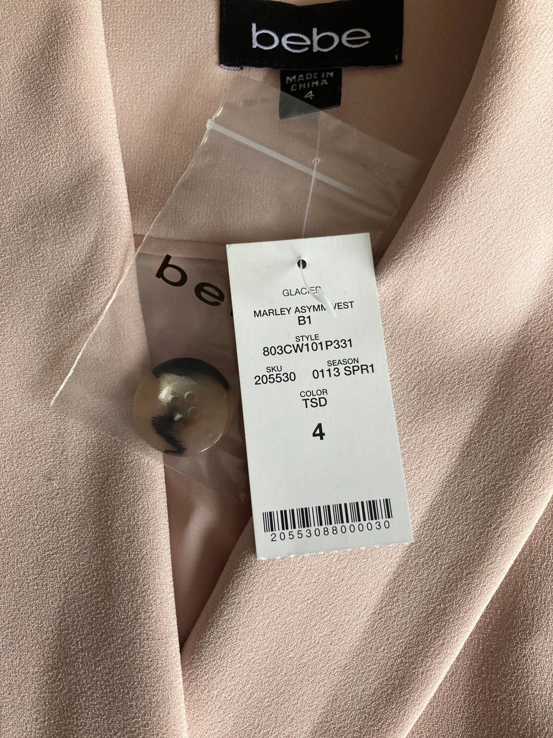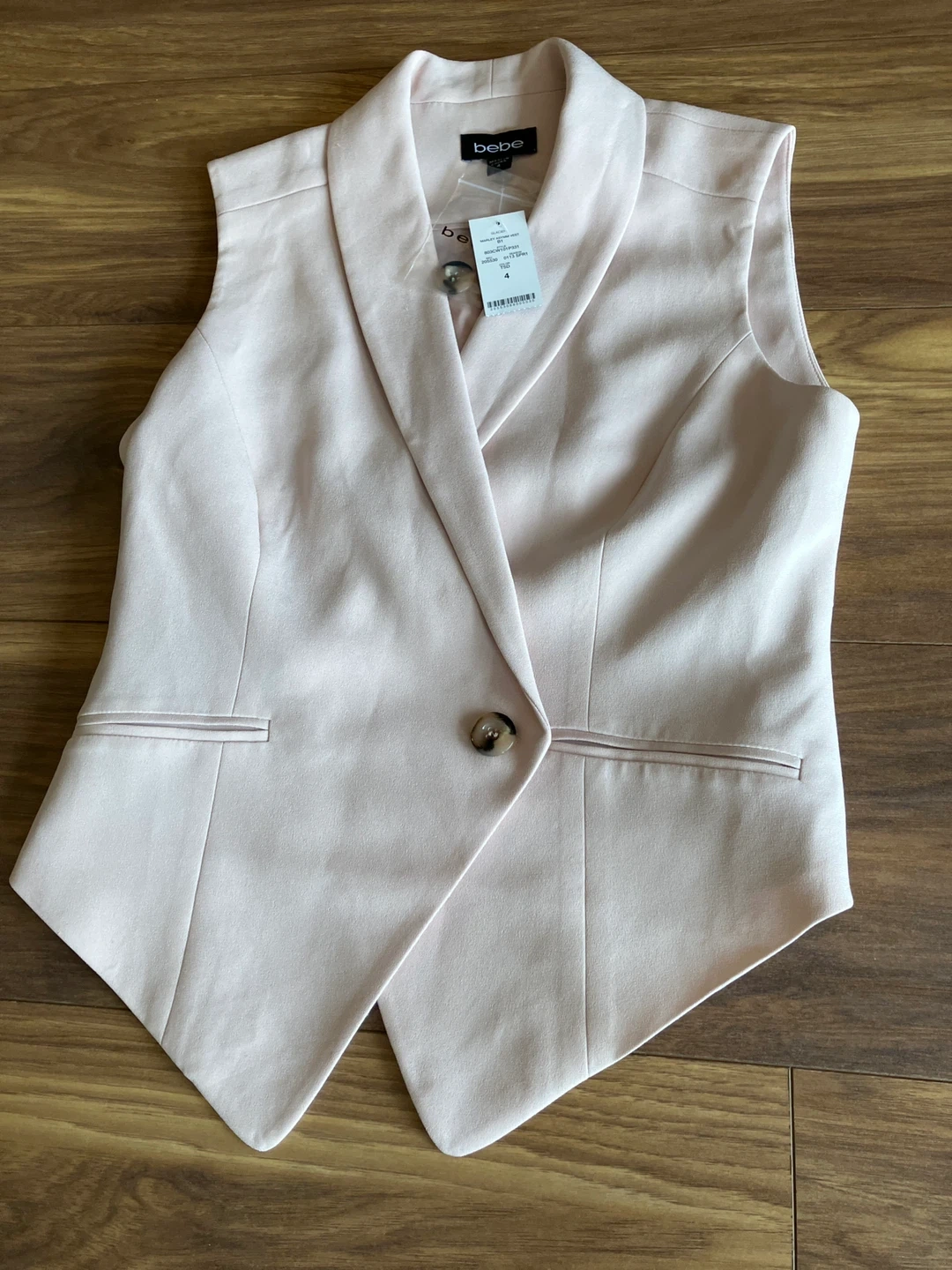 This is a new Bebe Marley Asymmetrical Vest in size 4. It's a pale pink colour with a single tortoiseshell button closure. The vest features a stylish asymmetrical hemline.