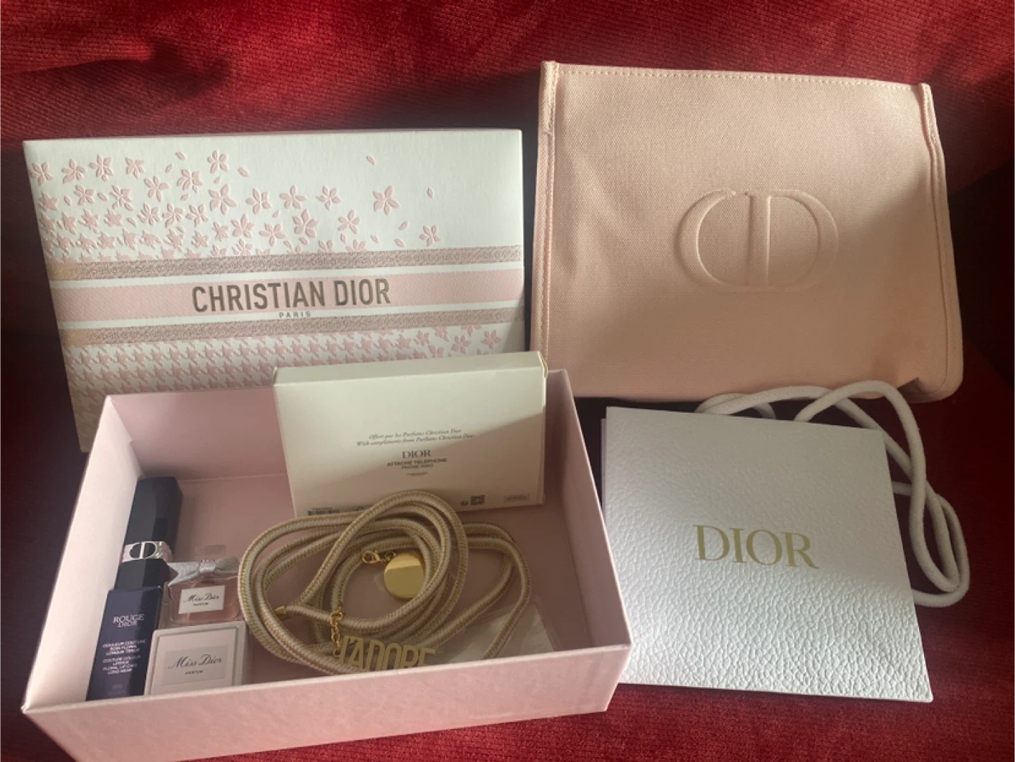 It comes with pink Dior pouch and phone ring!