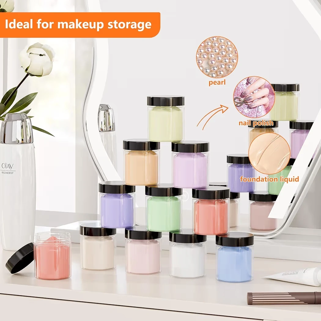 Clear plastic jars with black lids, perfect for makeup, spices, snacks, or crafts. Each jar measures 2.1 inches wide and 2.6 inches tall. High transparency and reusable design!