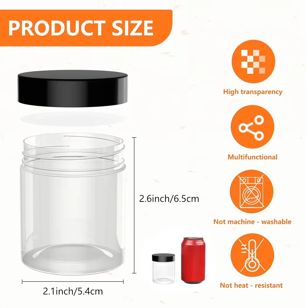 Clear plastic jars with black lids, perfect for makeup, spices, snacks, or crafts. Each jar measures 2.1 inches wide and 2.6 inches tall. High transparency and reusable design!