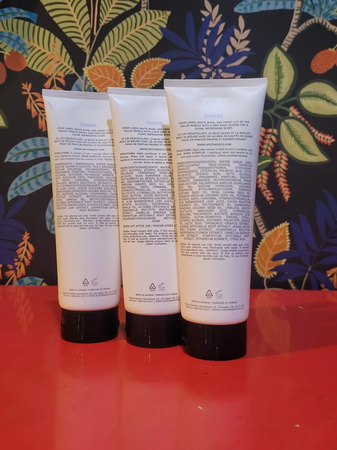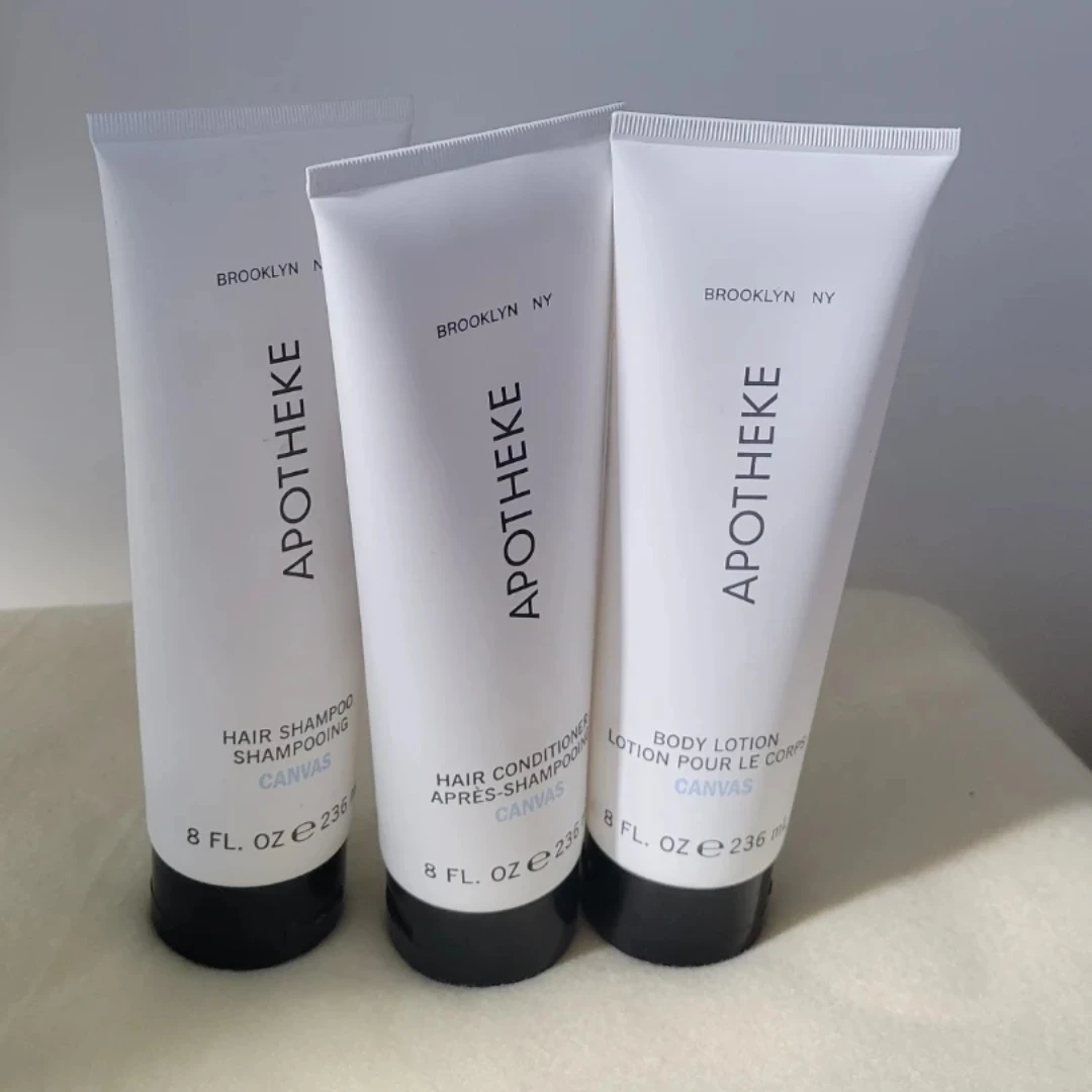 This Apotheke set includes hair shampoo, hair conditioner, and body lotion. Each bottle is 8 FL. OZ (236 ml). The scent is CANVAS. Not opened. Just had it in storage.