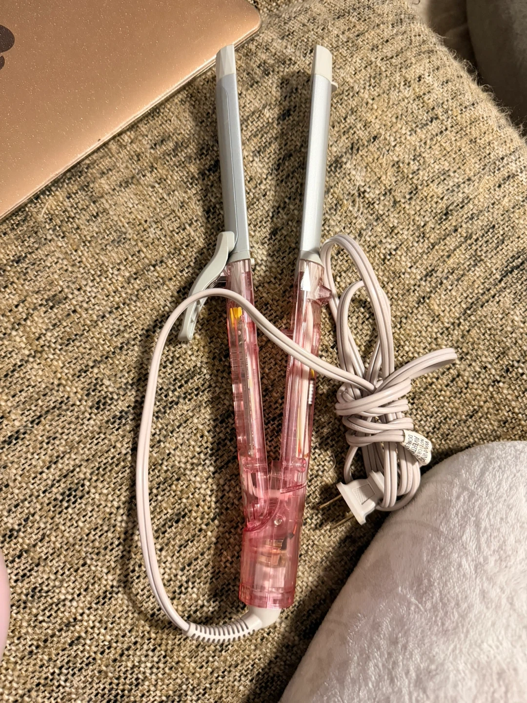 Hair straightener with a transparent pink handle and silver plates. It is also a hair curler. It's powered by a cord and plug. Great for quick touch-ups on the go! Pick up in Brentwood Concord