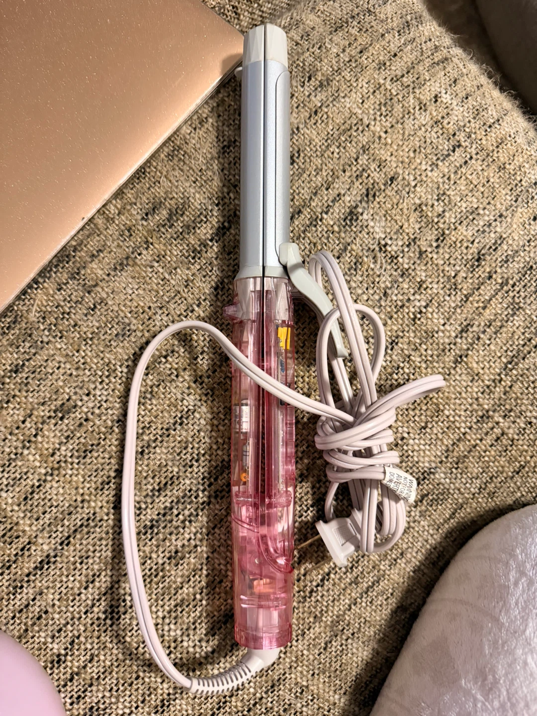 Hair straightener with a transparent pink handle and silver plates. It is also a hair curler. It's powered by a cord and plug. Great for quick touch-ups on the go! Pick up in Brentwood Concord