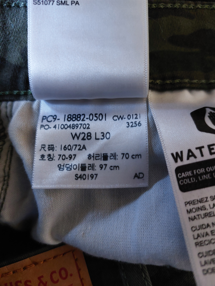 Levi's 721 camouflage jeans W 28 L 30, I love the colour and wore them once, and they are too small, I need 29. I still have a tag that I removed. I am not able to find this colour anymore :(. My loss, your gain. these jeans are over 100 + tax in Levi's store, and this colour is not available anymore. Asking $59 OBO. Pick up in Thornhill.