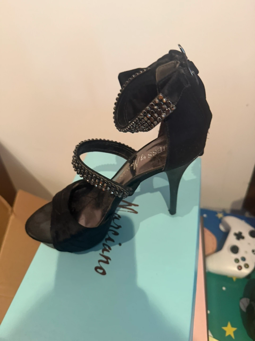 Black suede heeled sandals from Guess by Marciano. Embellished with rhinestones on the straps. Zips up the back for closure. Perfect for a night out!