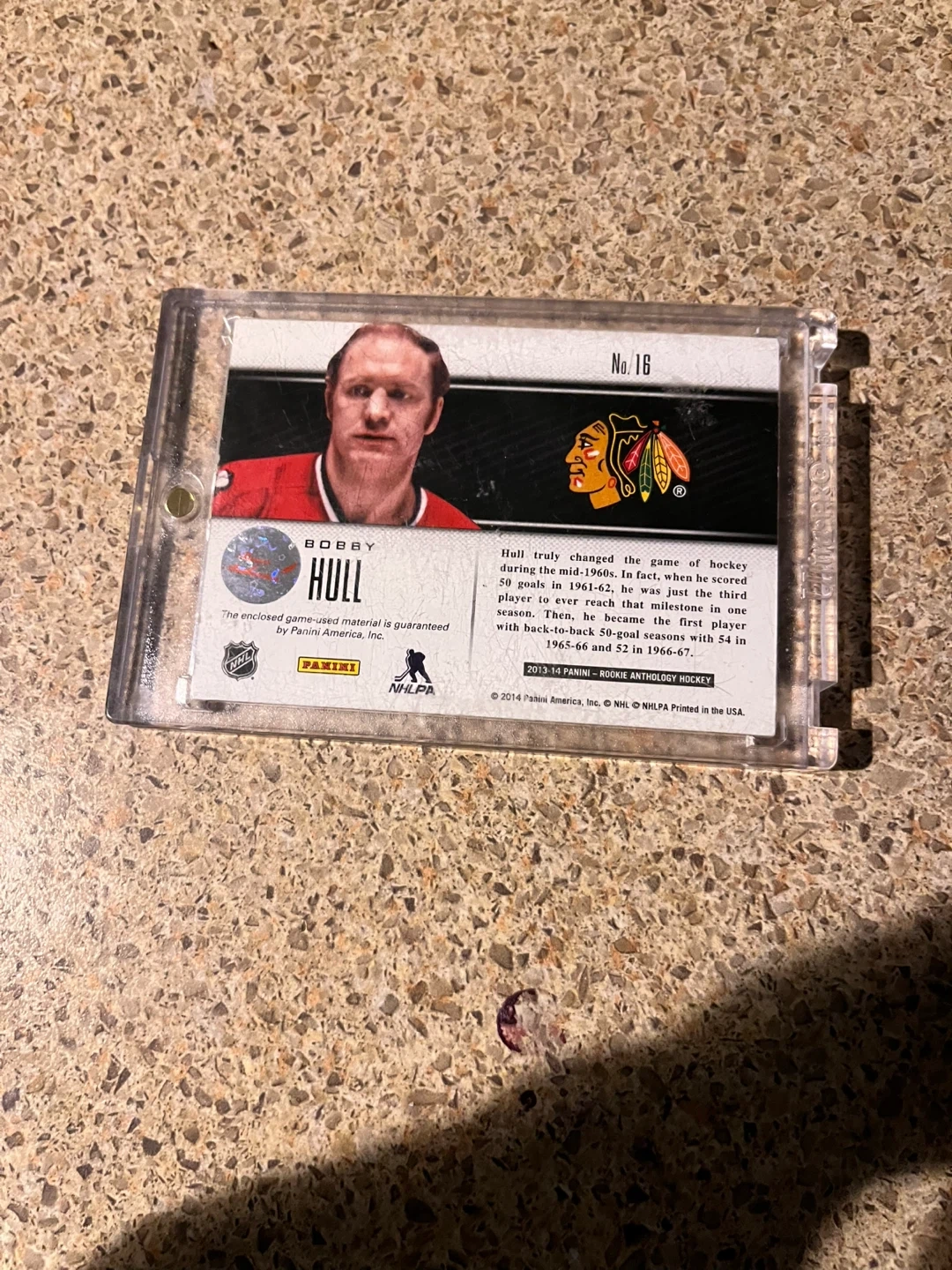 This is a 2013-14 Panini Rookie Anthology Hockey card featuring Bobby Hull. It's serial numbered 131/199 and includes a piece of game-used material. The card is encased for protection. Bobby Hull played hockey during the mid-1960s.