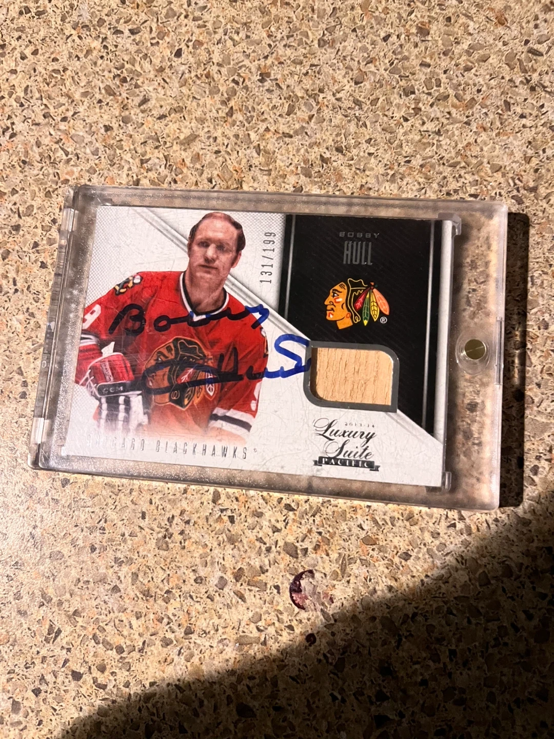 This is a 2013-14 Panini Rookie Anthology Hockey card featuring Bobby Hull. It's serial numbered 131/199 and includes a piece of game-used material. The card is encased for protection. Bobby Hull played hockey during the mid-1960s.